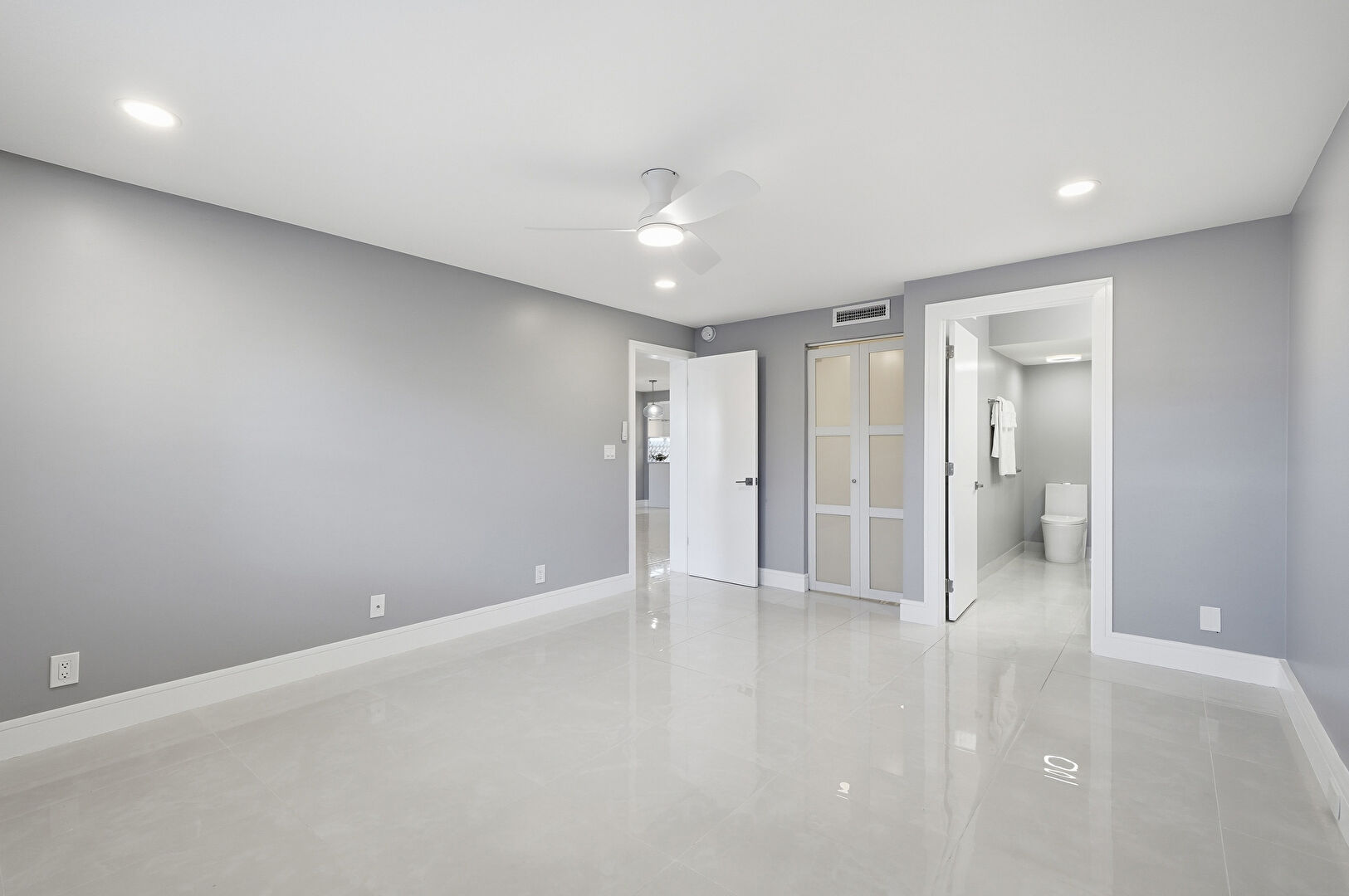 Baseboards Wall, Ceiling Fan, Drywall, Ensuite Bathroom, Natural Light, Recessed Lighting, Vent, Ceiling Fan, Tile Floor