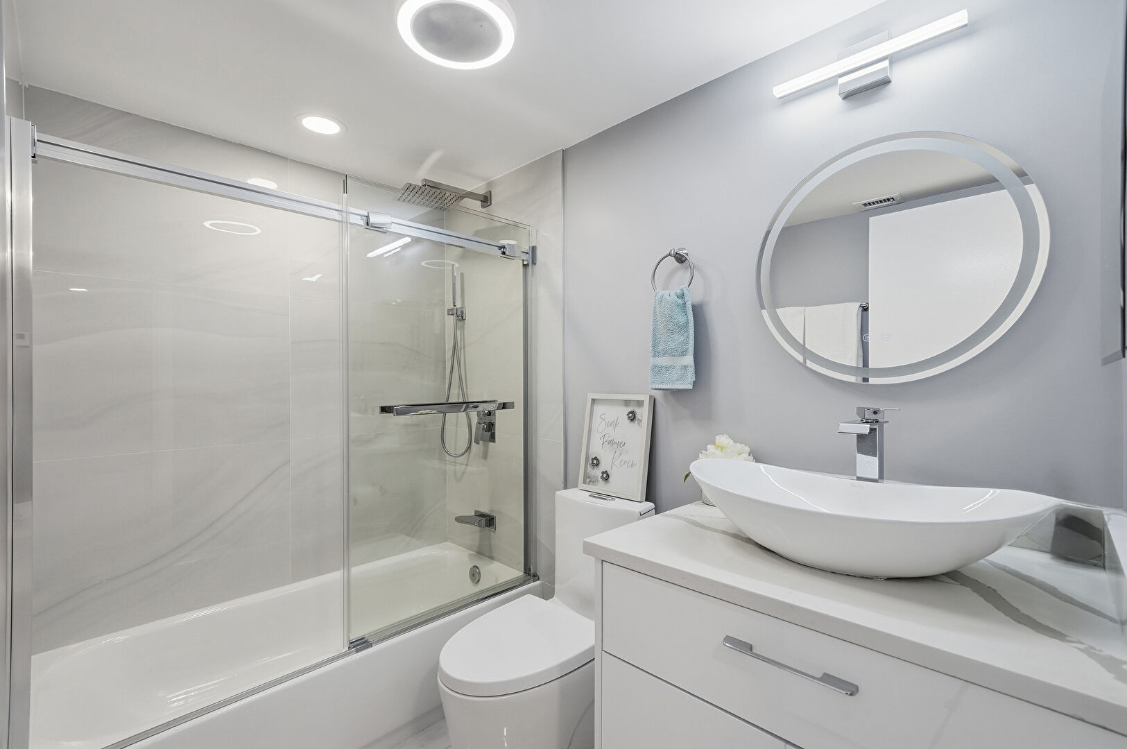 Combined Bath Shower, Drywall, Recessed Lighting, Vanity, Full Bathroom