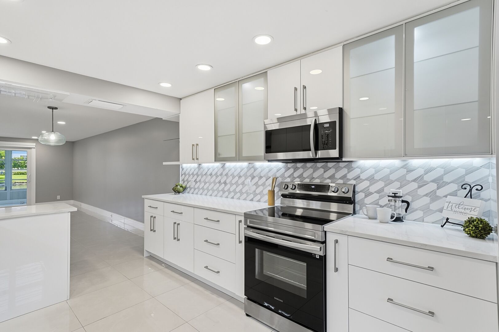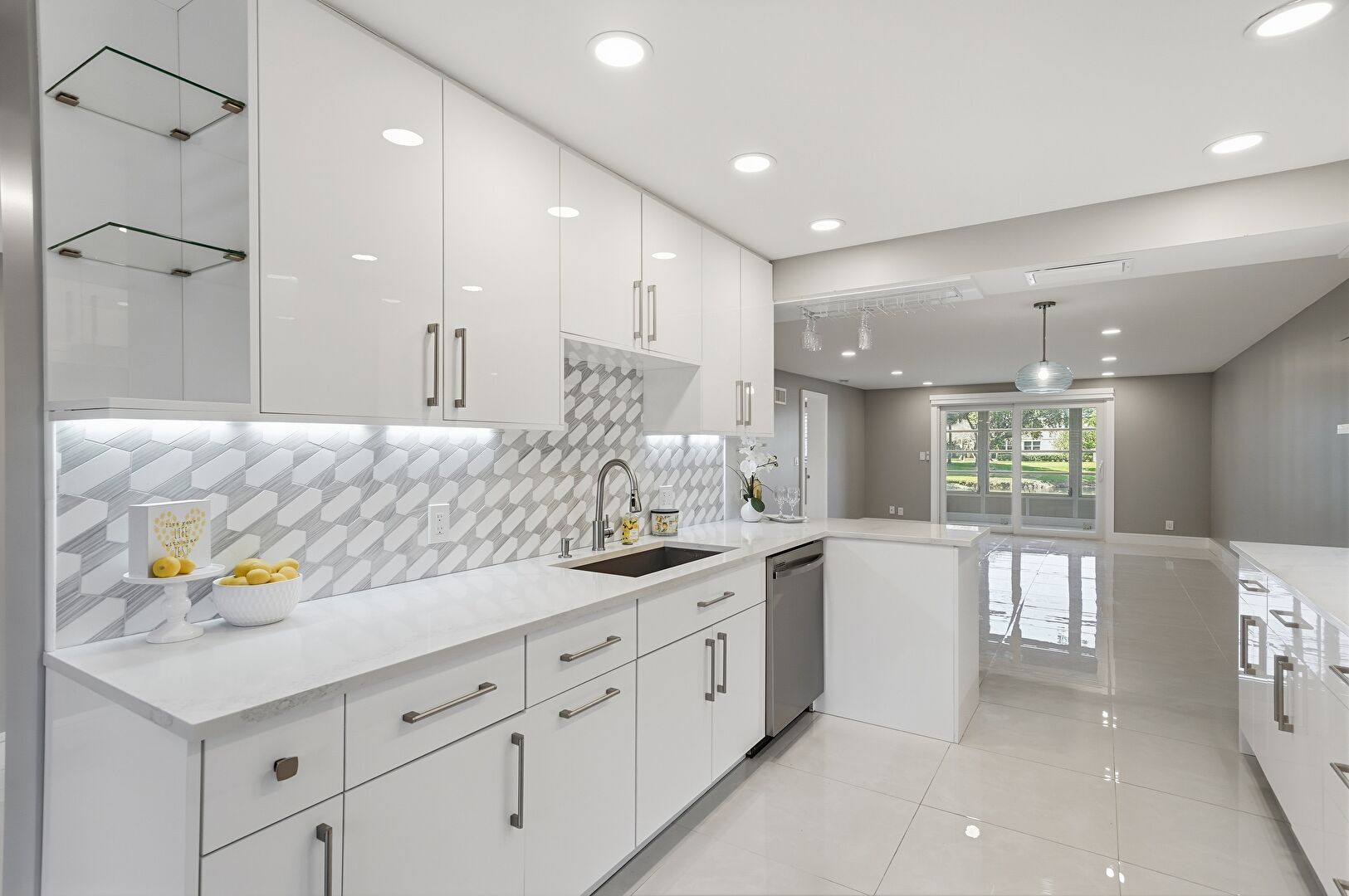 Baseboards Wall, Drywall, Flat Panel Cabinets, Glass Insert Cabinets, Kitchen Peninsula, Natural Light, Open Shelves, Pendant Lighting, Recessed Lighting, Stone Countertops, Tile Floor, Vent, Wine Cooler, Pendant Lighting, Recessed Lighting, Tile Floor