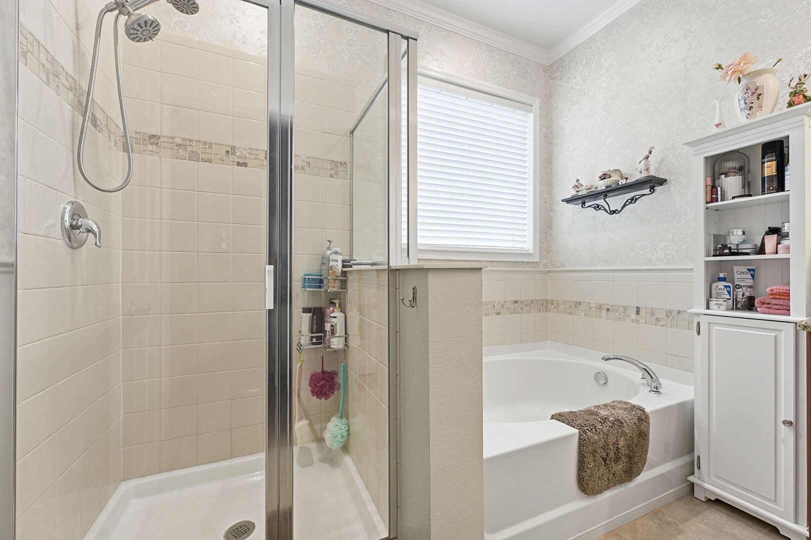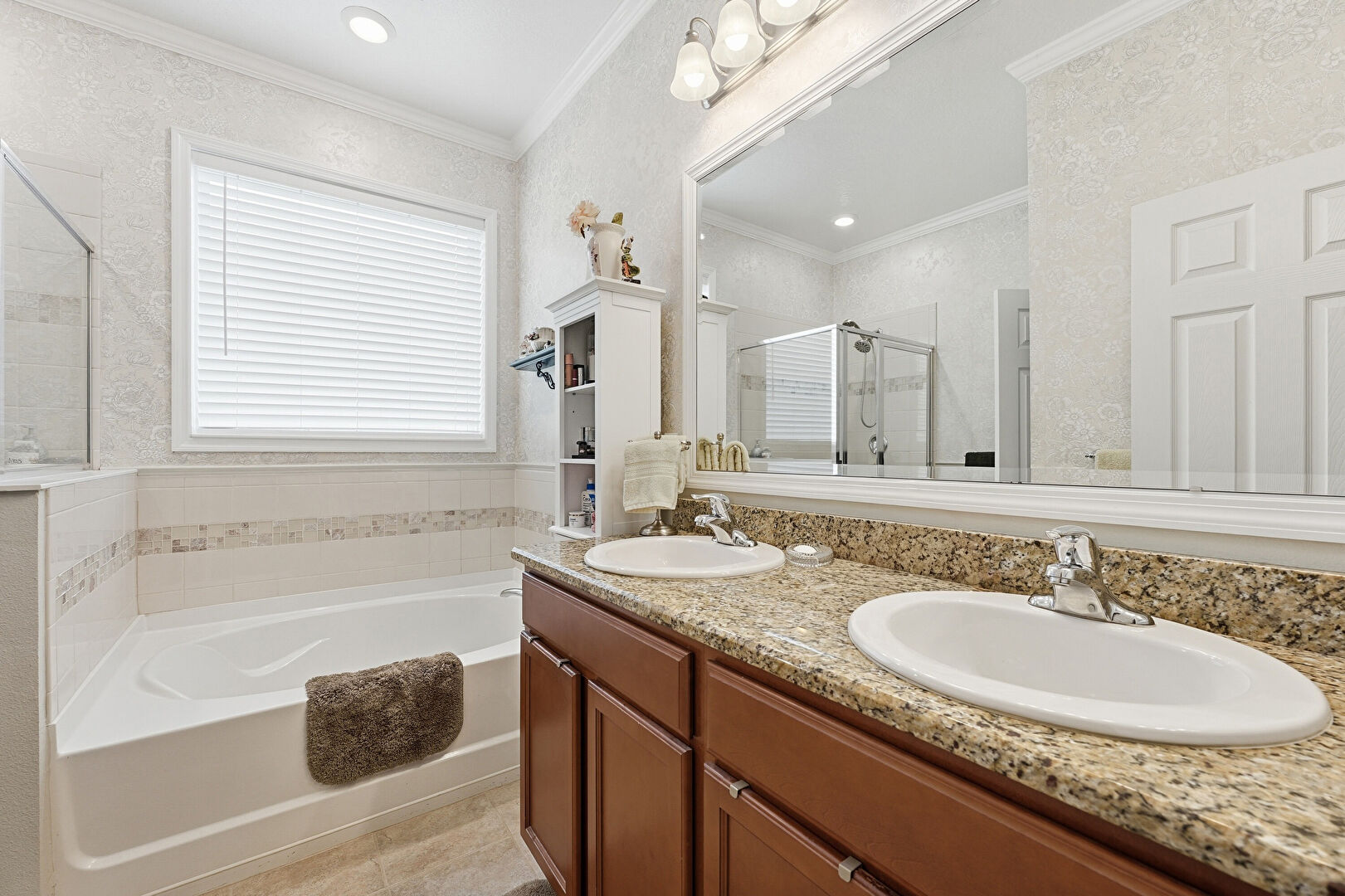 Crown Molding, Double Vanity, Full Bathroom, Half Bathroom, Natural Light, Textured Wall, Tile Floor, Vanity, Wallpaper Wall, Baseboards Wall, Crown Molding, Vanity