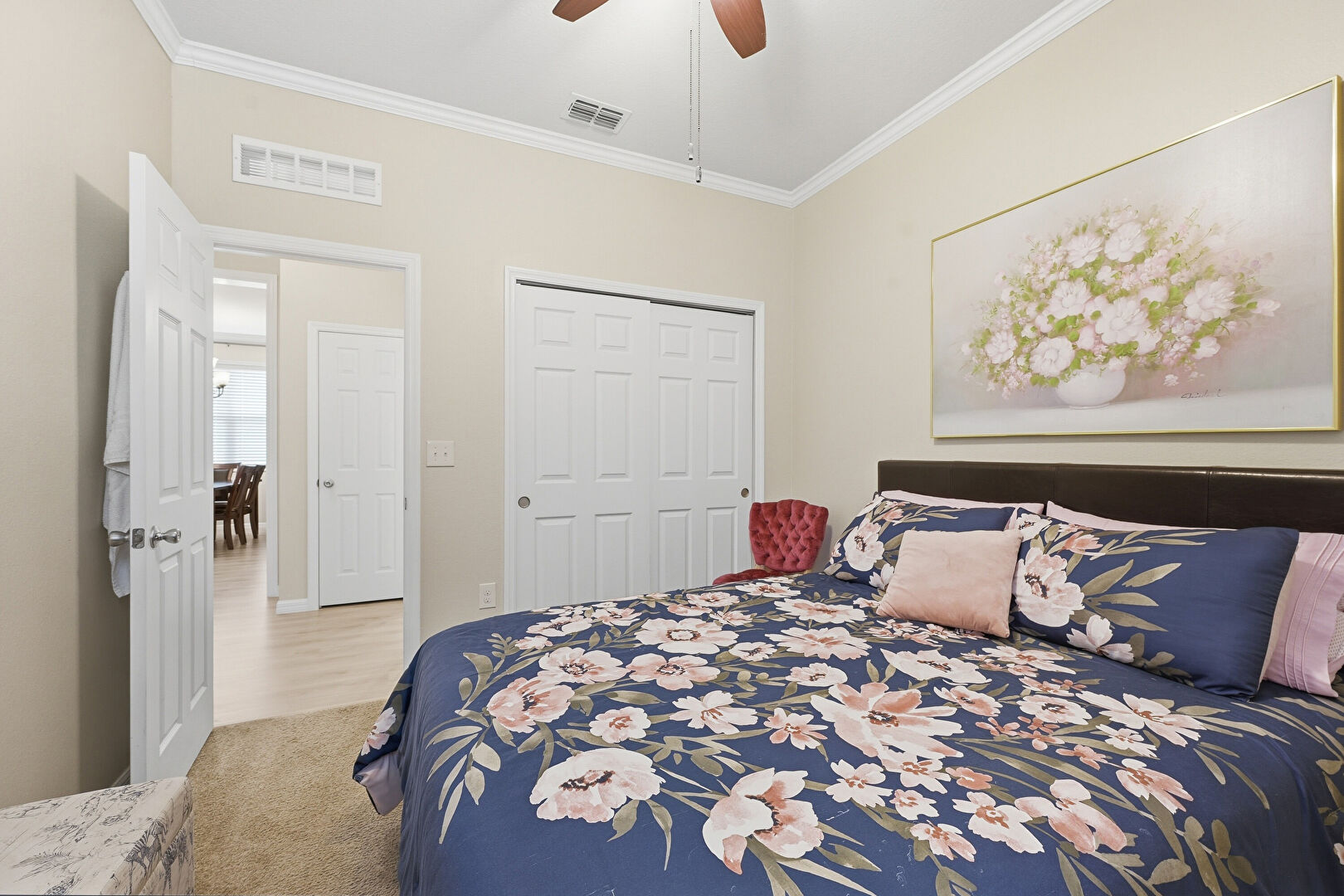 Baseboards Wall, Carpet, Ceiling Fan, Crown Molding, Drywall, Natural Light, Smoke Carbon Monoxide Detector, Vent, Walk In Closet, Baseboards Wall, Drywall