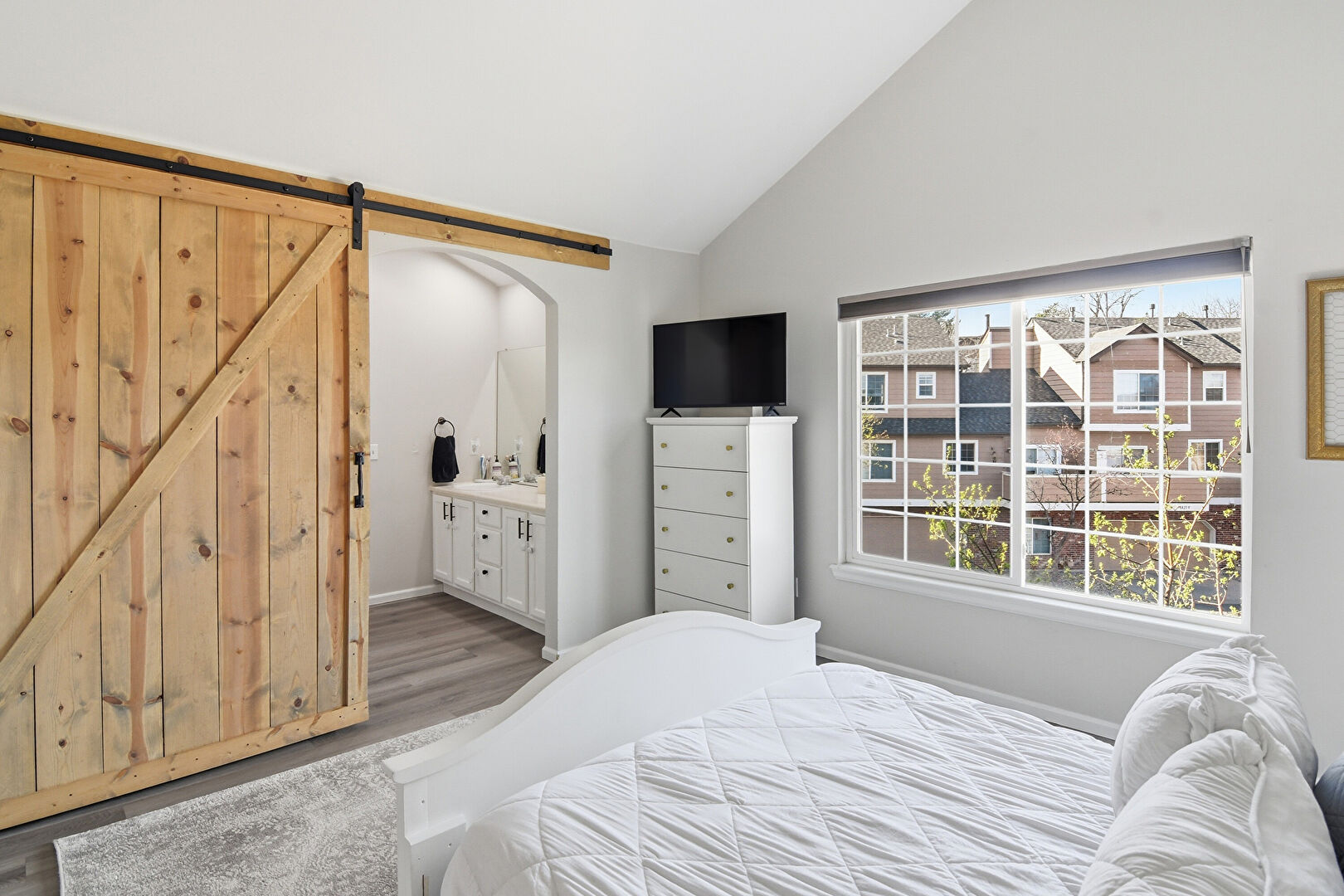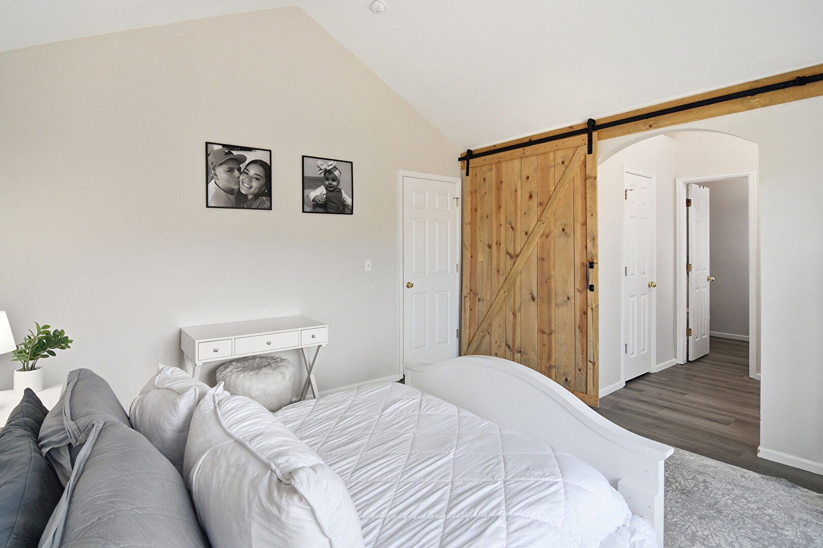 Arched Walkways, Barn Door, Baseboards Wall, Cathedral Ceiling, Drywall, Ensuite Bathroom, High Ceiling, Natural Light, Vaulted Ceiling, Vent, Wood Finish Floor, Baseboards Wall, High Ceiling, Natural Light, Vaulted Ceiling