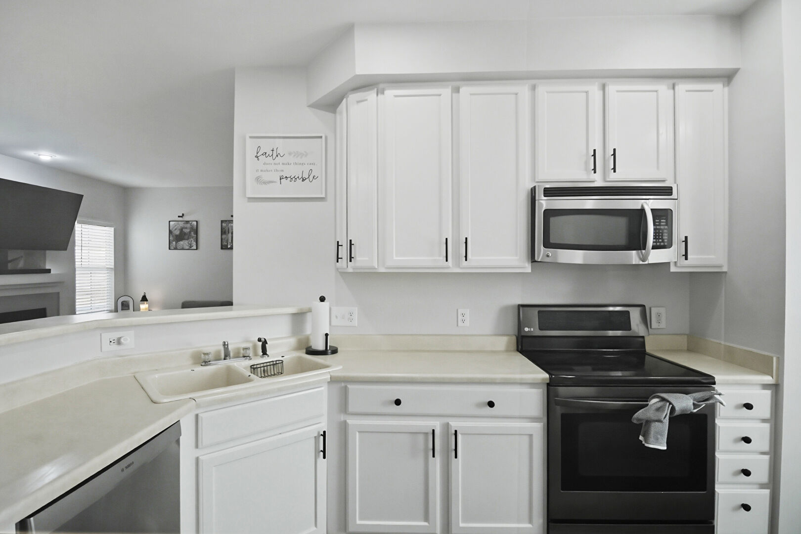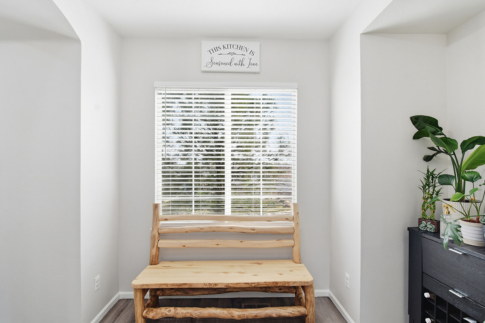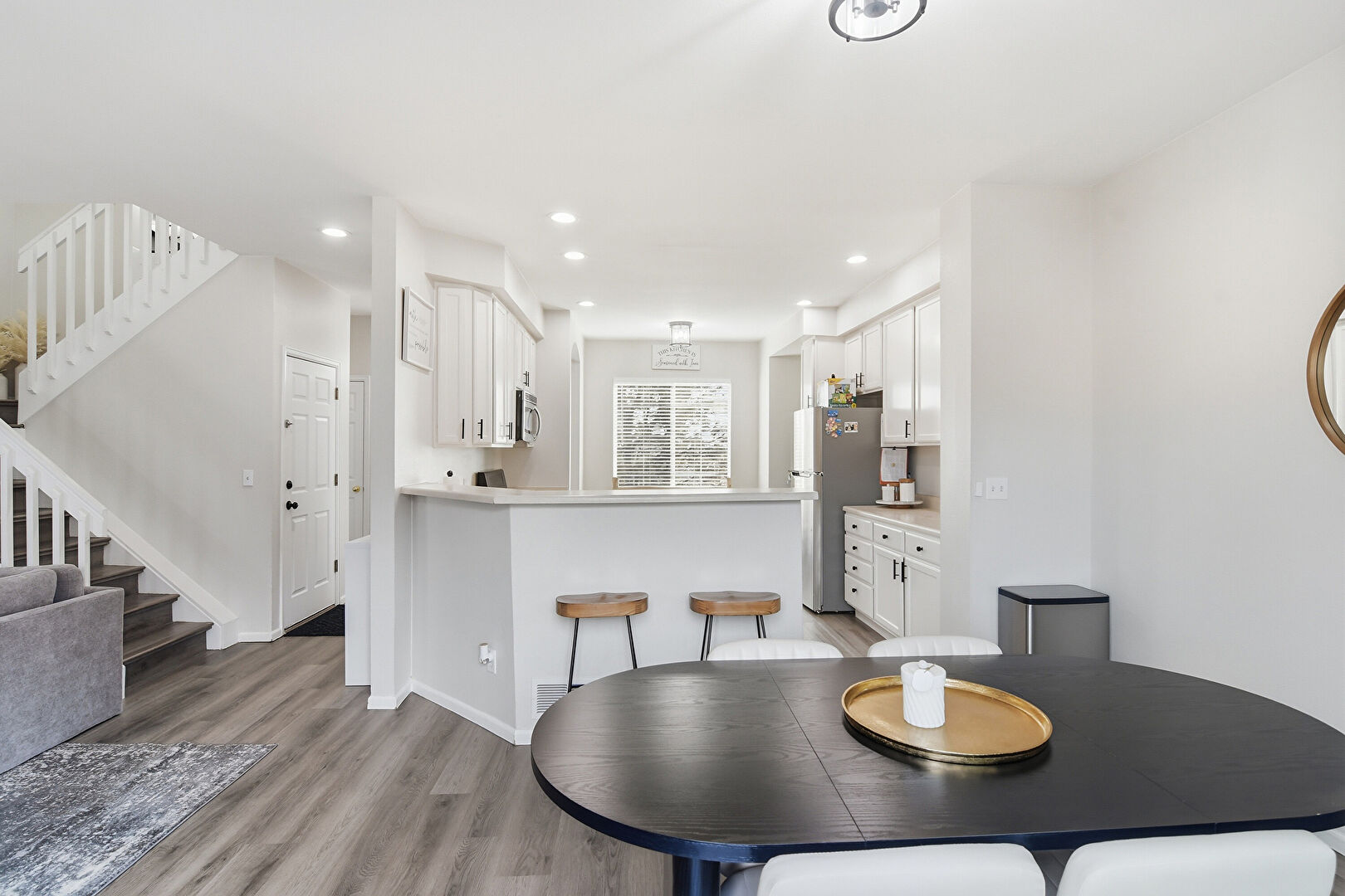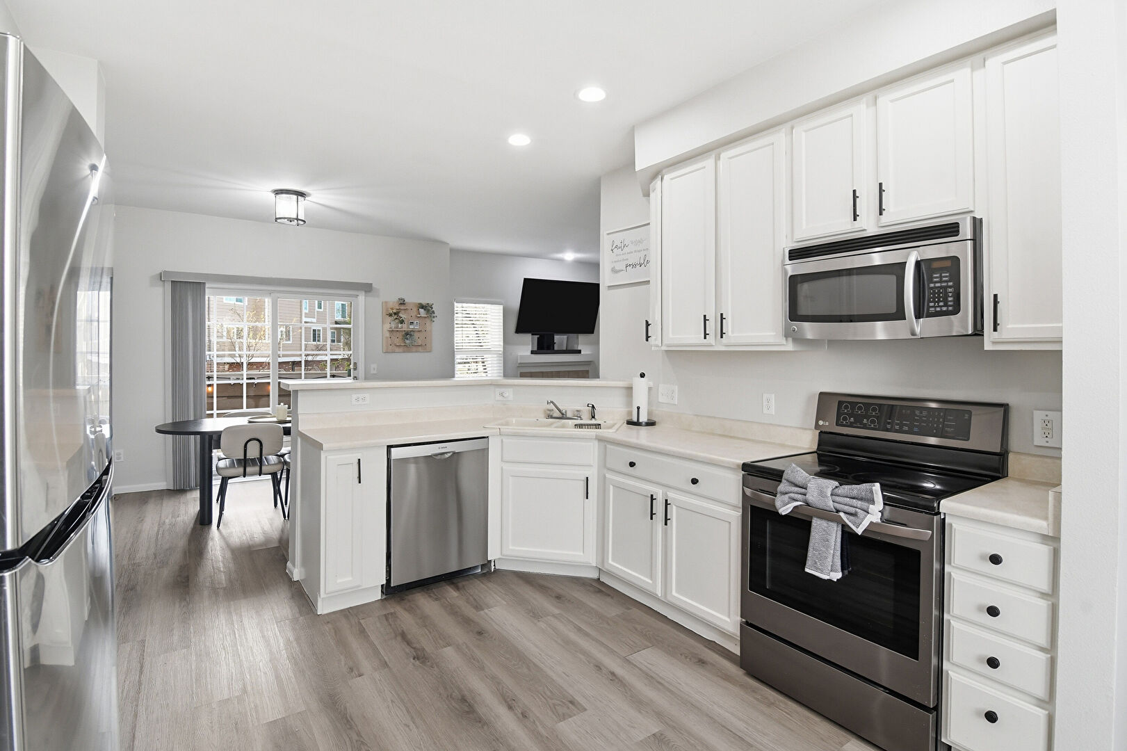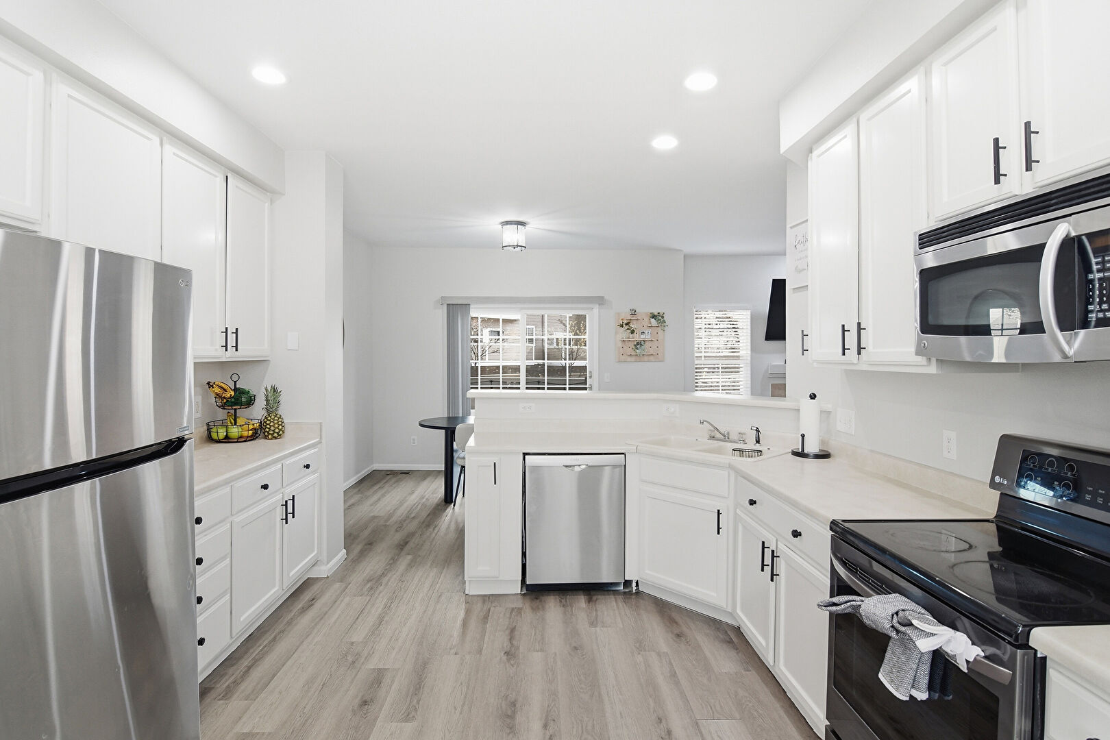 Baseboards Wall, Drywall, Kitchen Peninsula, Natural Light, Opens To Living Area, Recessed Lighting, Shaker Cabinets, Wood Finish Floor, Baseboards Wall, Fireplace, Natural Light