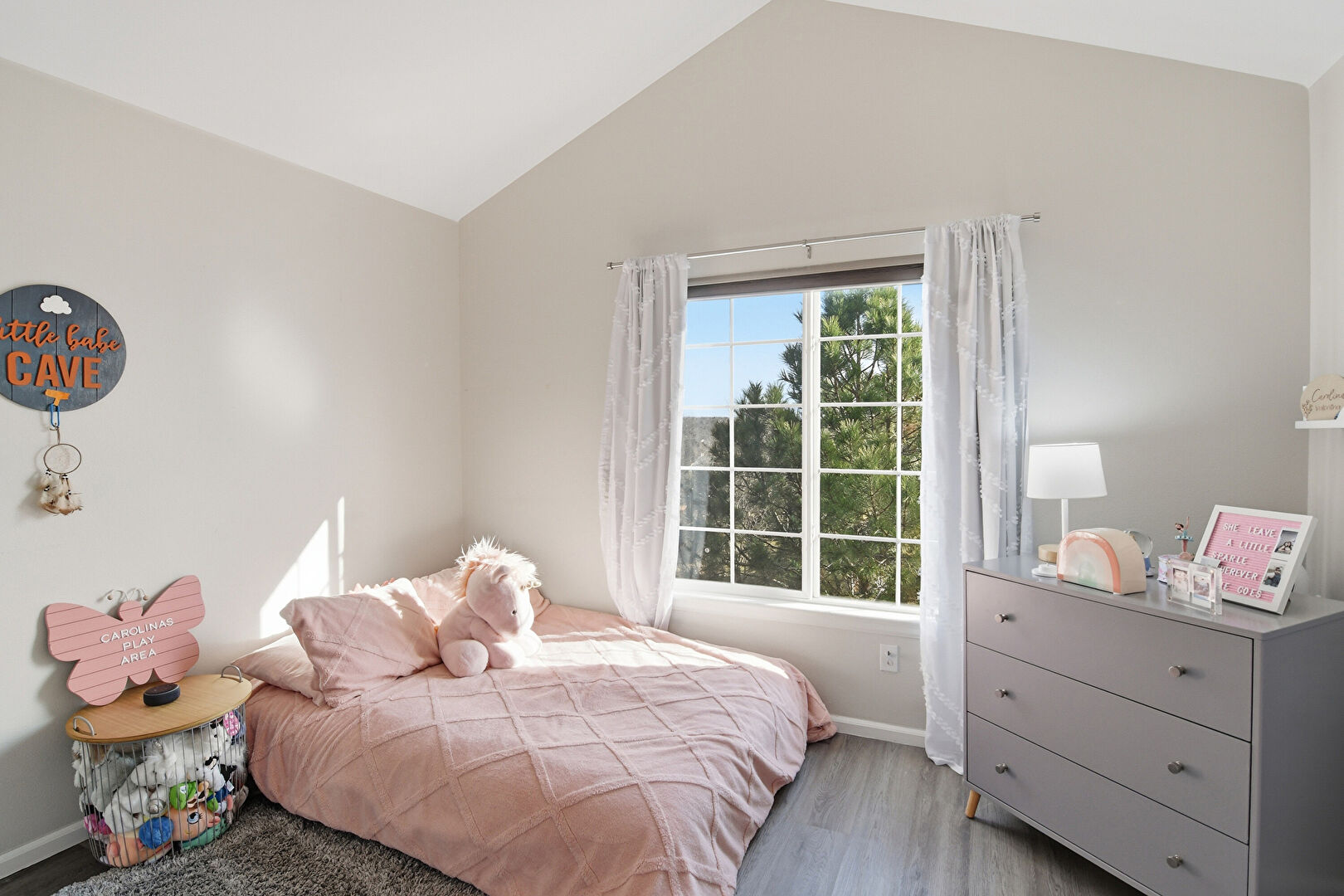 Baseboards Wall, Drywall, High Ceiling, Natural Light, Vaulted Ceiling, Wood Finish Floor, Cathedral Ceiling, Wood Finish Floor