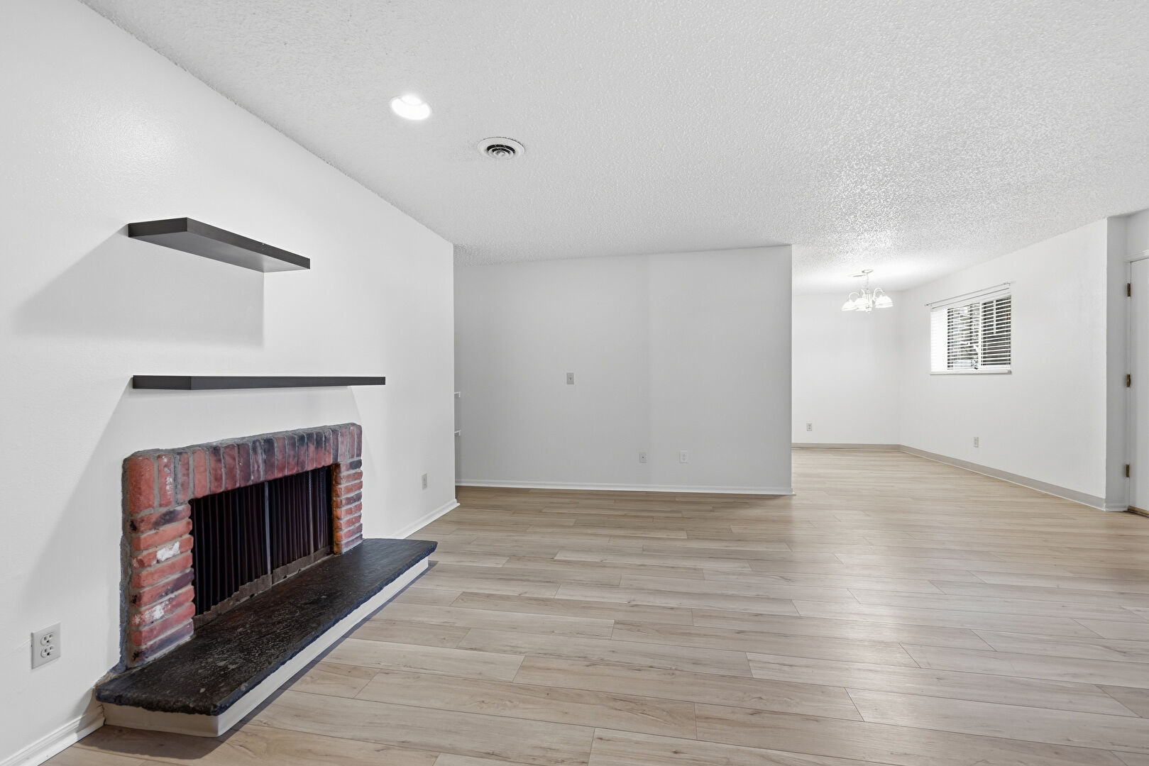 Baseboards Wall, Drywall, Fireplace, Natural Light, Notable Chandelier, Textured Ceiling, Vent, Wood Finish Floor, Recessed Lighting, Textured Ceiling, Wood Finish Floor