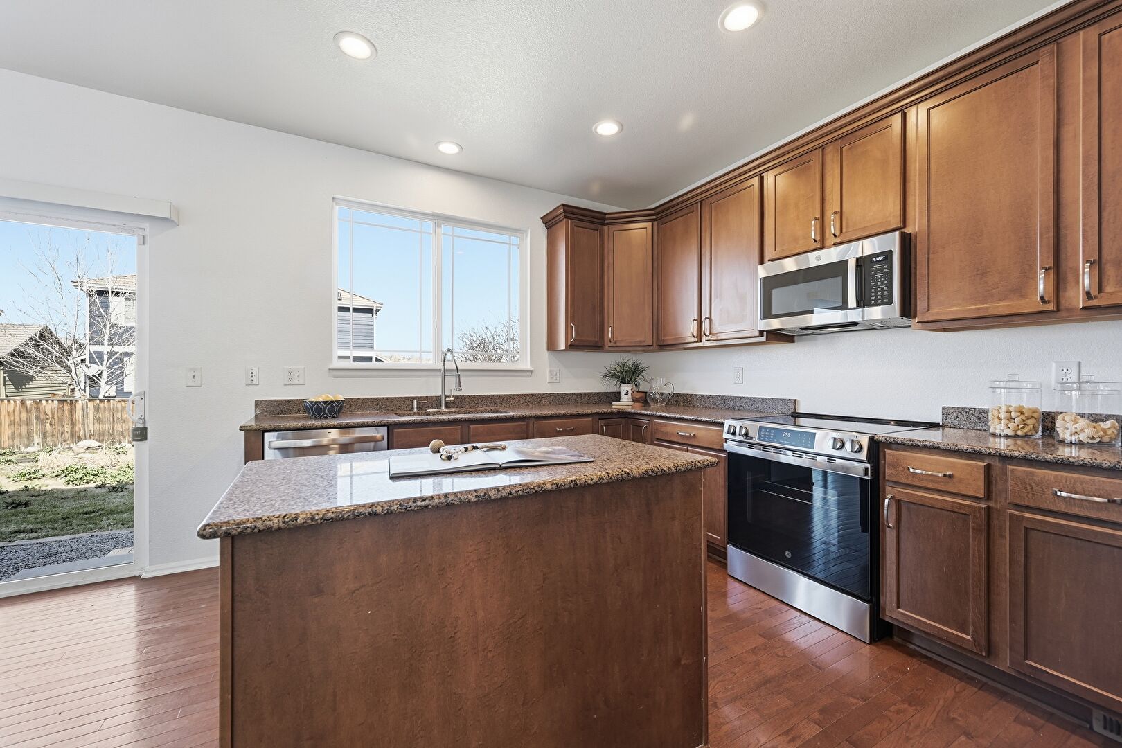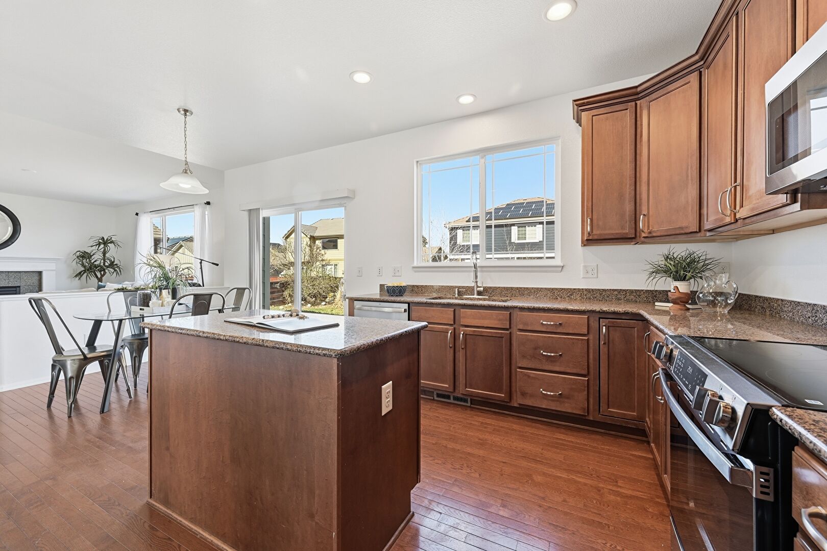 Baseboards Wall, Crown Molding Cabinets, Dark Brown Cabinets, Drywall, Fireplace, Kitchen Island, Medium Brown Cabinets, Natural Light, Pendant Lighting, Recessed Lighting, Shaker Cabinets, Stone Countertops, Vent, Wood Finish Floor, Crown Molding Cabinets, Dark Brown Cabinets, Shaker Cabinets