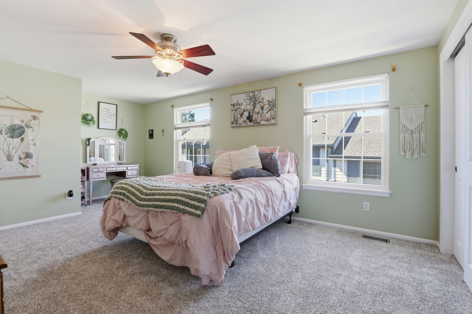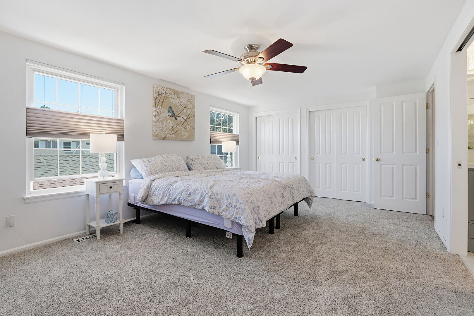 Baseboards Wall, Carpet, Ceiling Fan, Closet, Drywall, Ensuite Bathroom, Natural Light, Two Closets, Vent, Ceiling Fan, Ensuite Bathroom, Natural Light, Scuttle, Two Closets, Vent