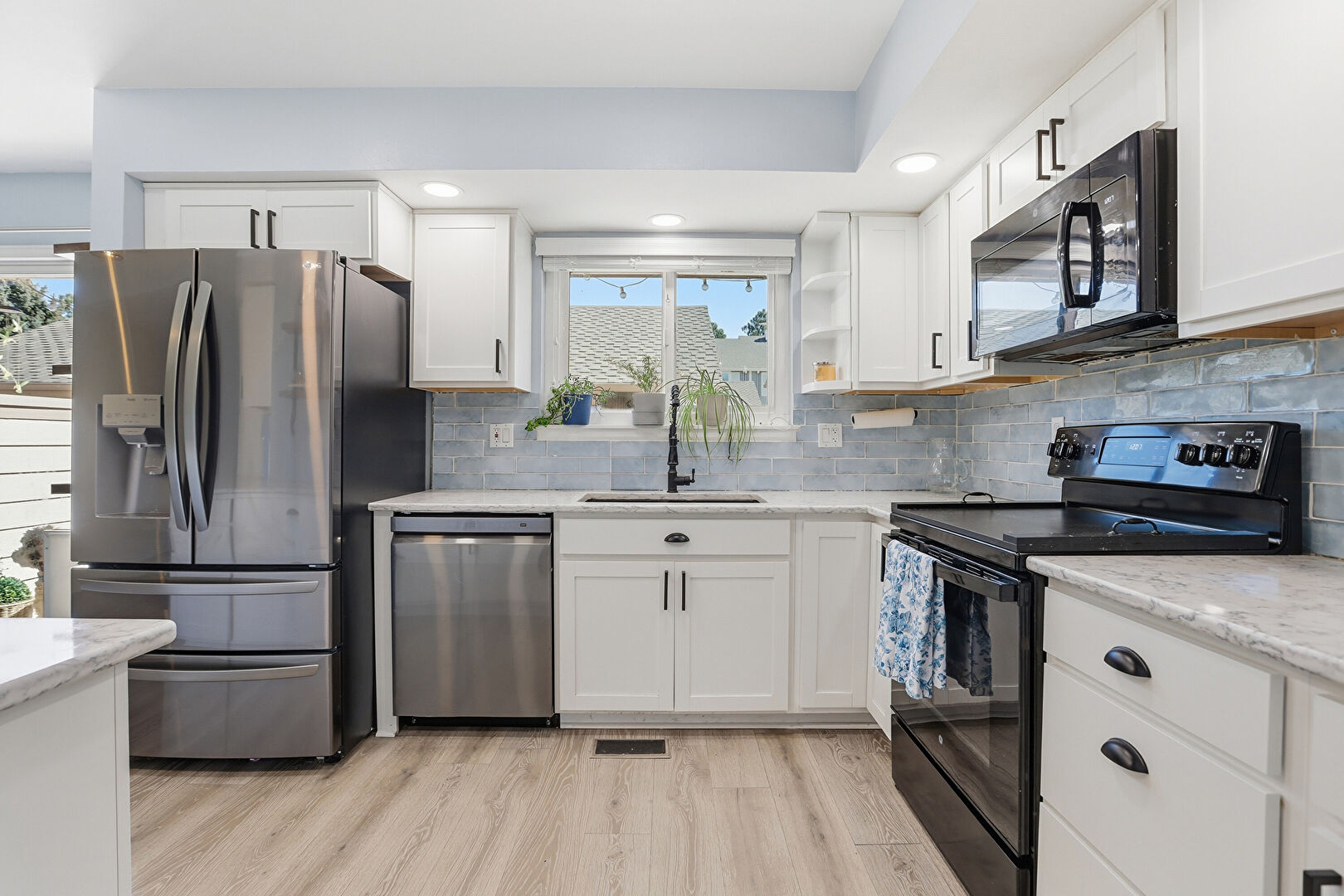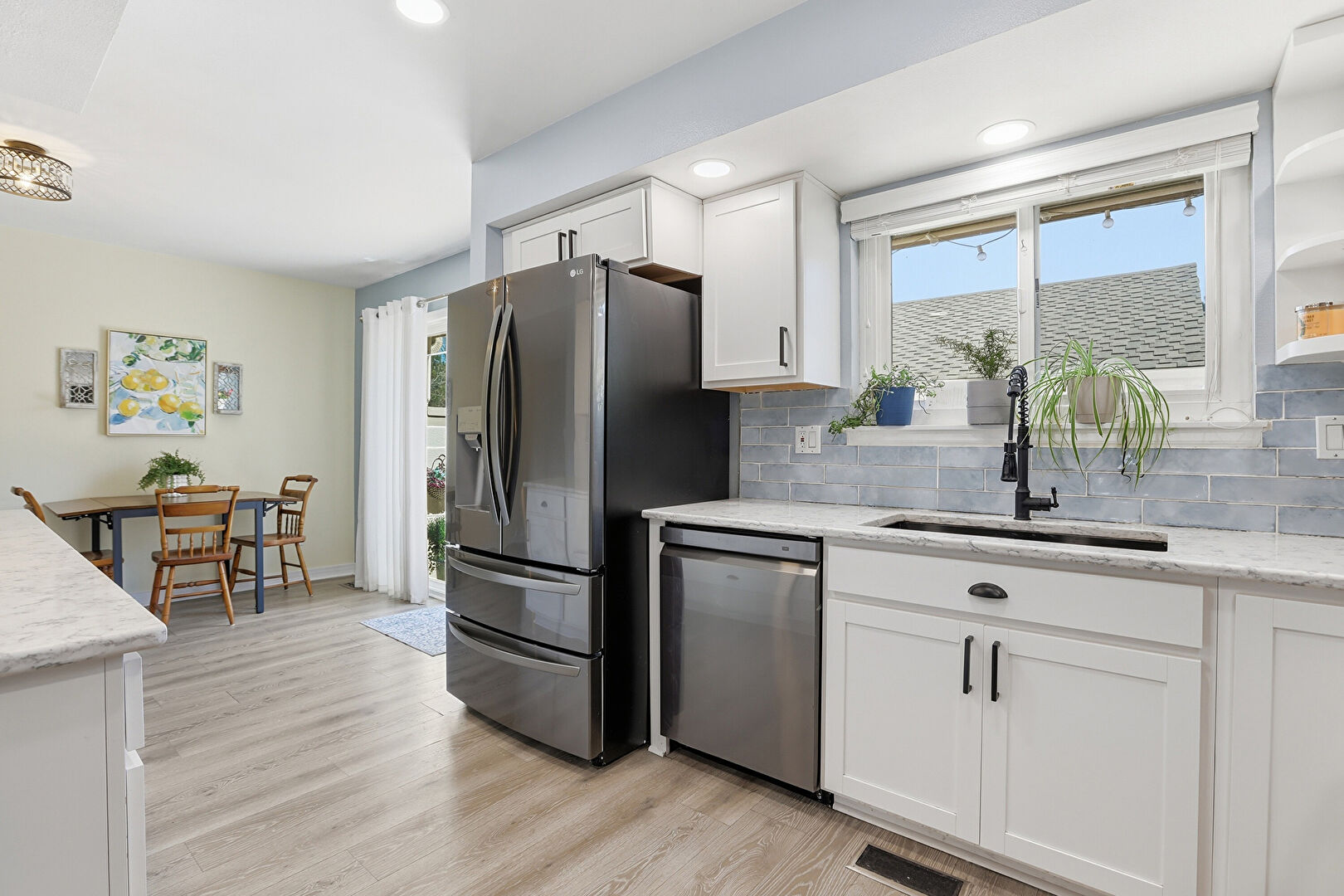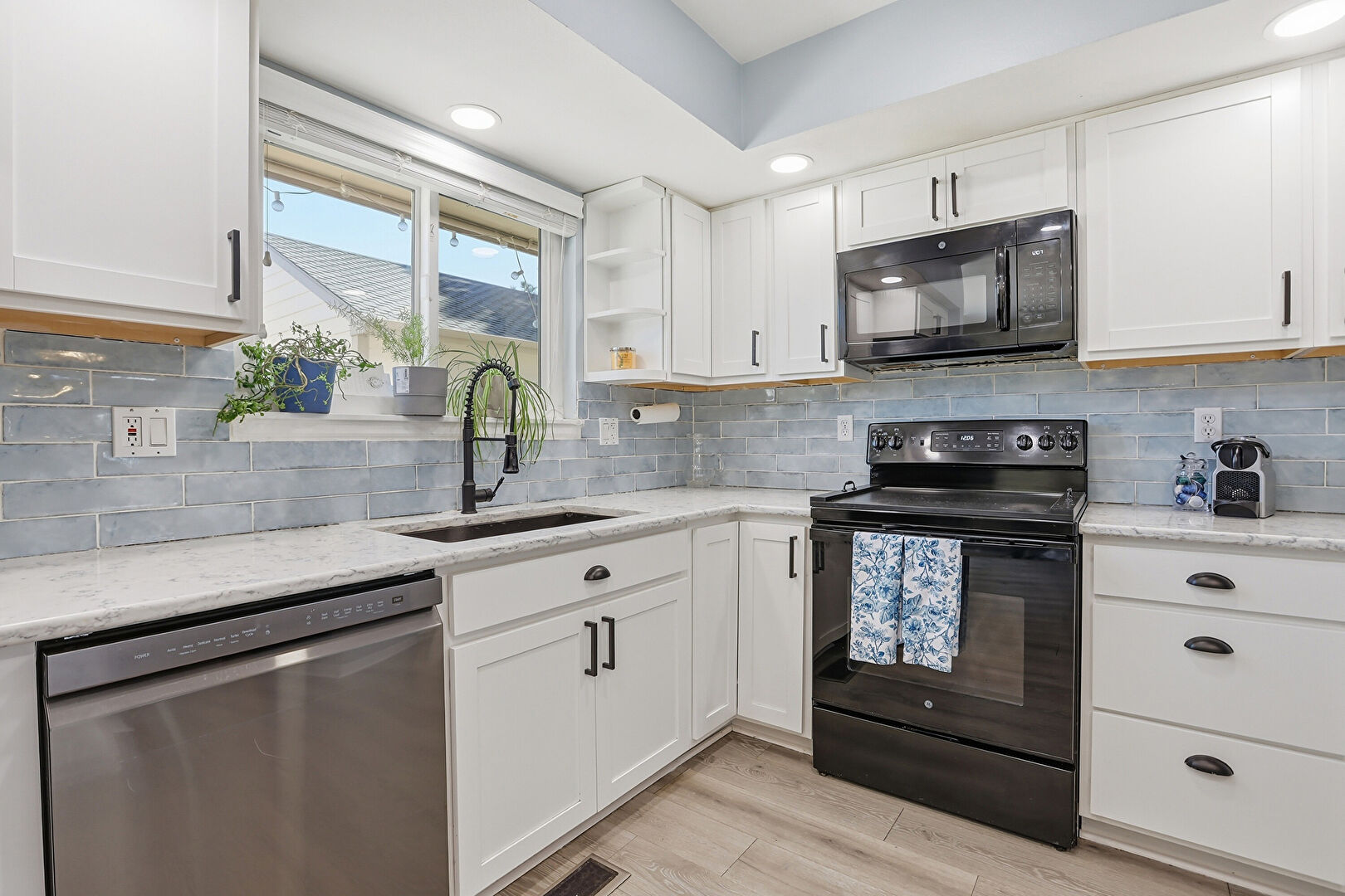 Baseboards Wall, Drywall, Mountain View, Natural Light, Open Shelves, Recessed Lighting, Shaker Cabinets, Stone Countertops, Vent, Wood Finish Floor, Drywall, Natural Light, Open Shelves, Shaker Cabinets, Vent