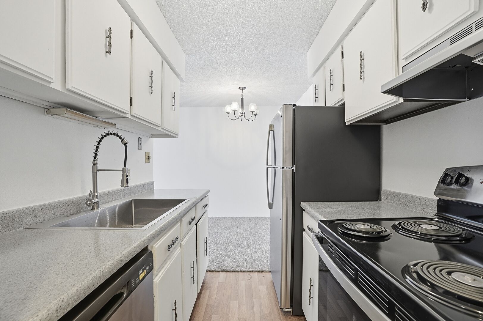 Drywall, Galley Kitchen, Notable Chandelier, Pendant Lighting, Textured Ceiling, Visible Hinge Cabinets, Wood Finish Floor, Galley Kitchen, Textured Ceiling