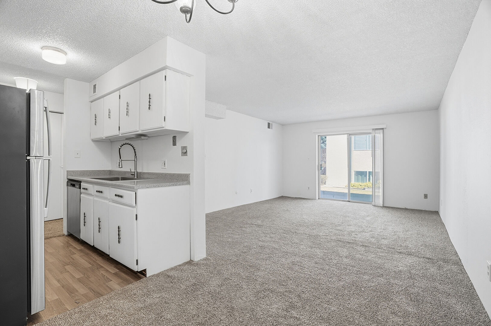 Carpet, Drywall, Galley Kitchen, Kitchen Peninsula, Natural Light, Notable Chandelier, Opens To Living Area, Pendant Lighting, Textured Ceiling, Vent, Visible Hinge Cabinets, Wood Finish Floor, Carpet, Notable Chandelier, Visible Hinge Cabinets