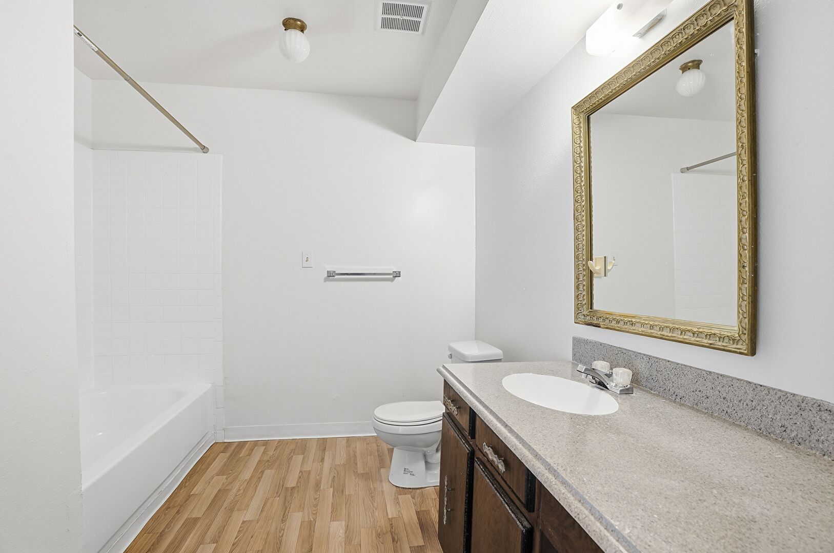 Baseboards Wall, Combined Bath Shower, Drywall, Full Bathroom, Vanity, Vent, Wood Finish Floor, Baseboards Wall, Combined Bath Shower, Vent
