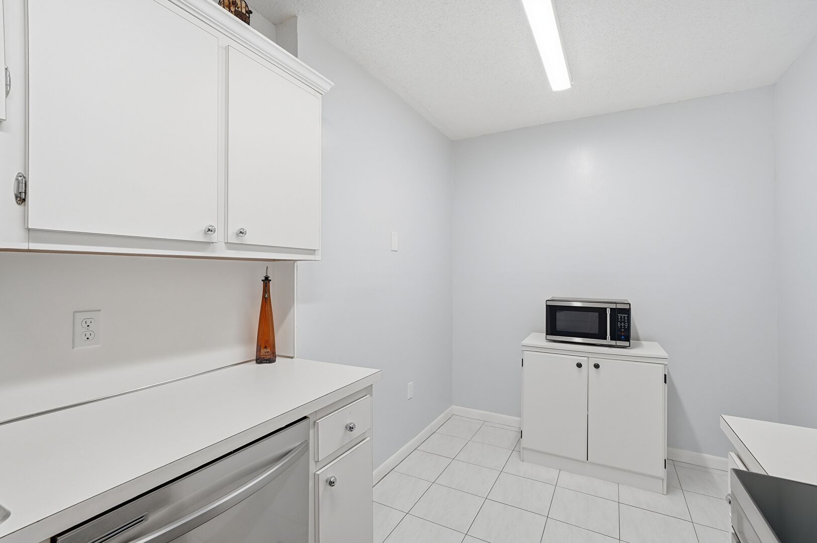 Baseboards Wall, Crown Molding Cabinets, Drywall, Electric Panel, Galley Kitchen, Textured Ceiling, Tile Floor, Vent, Visible Hinge Cabinets, Drywall, Galley Kitchen, Open Shelves, Textured Ceiling