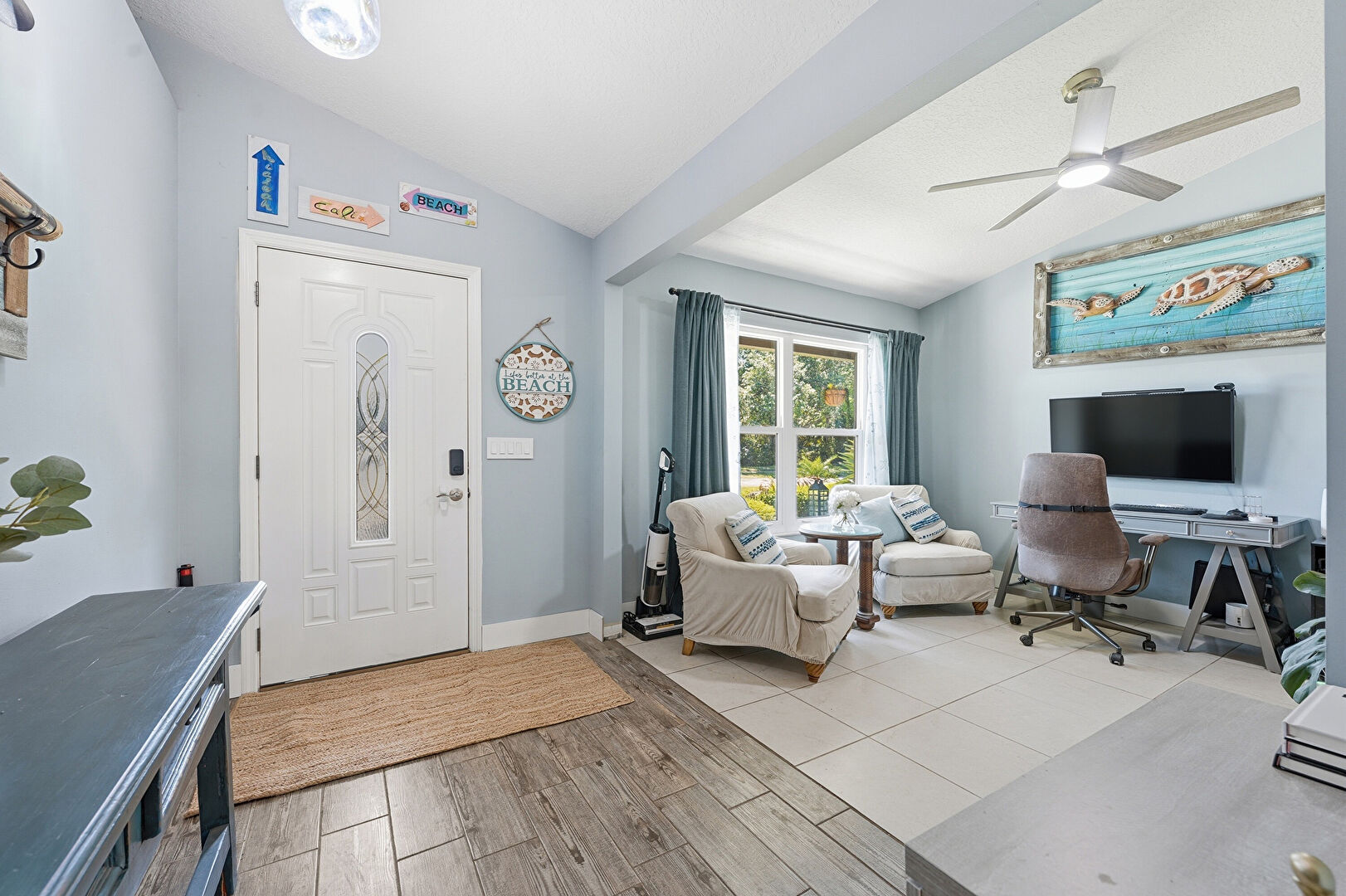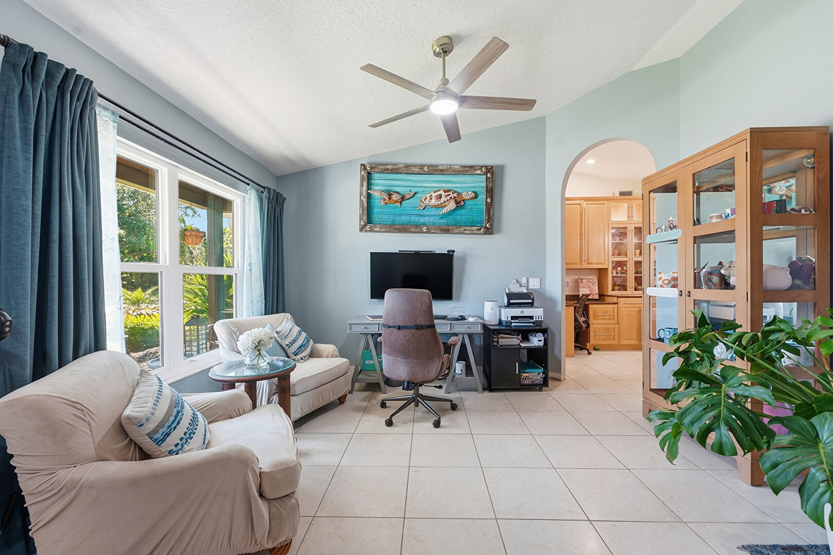 Arched Walkways, Ceiling Fan, Drywall, Office Area, Textured Ceiling, Tile Floor, Vaulted Ceiling, Natural Light