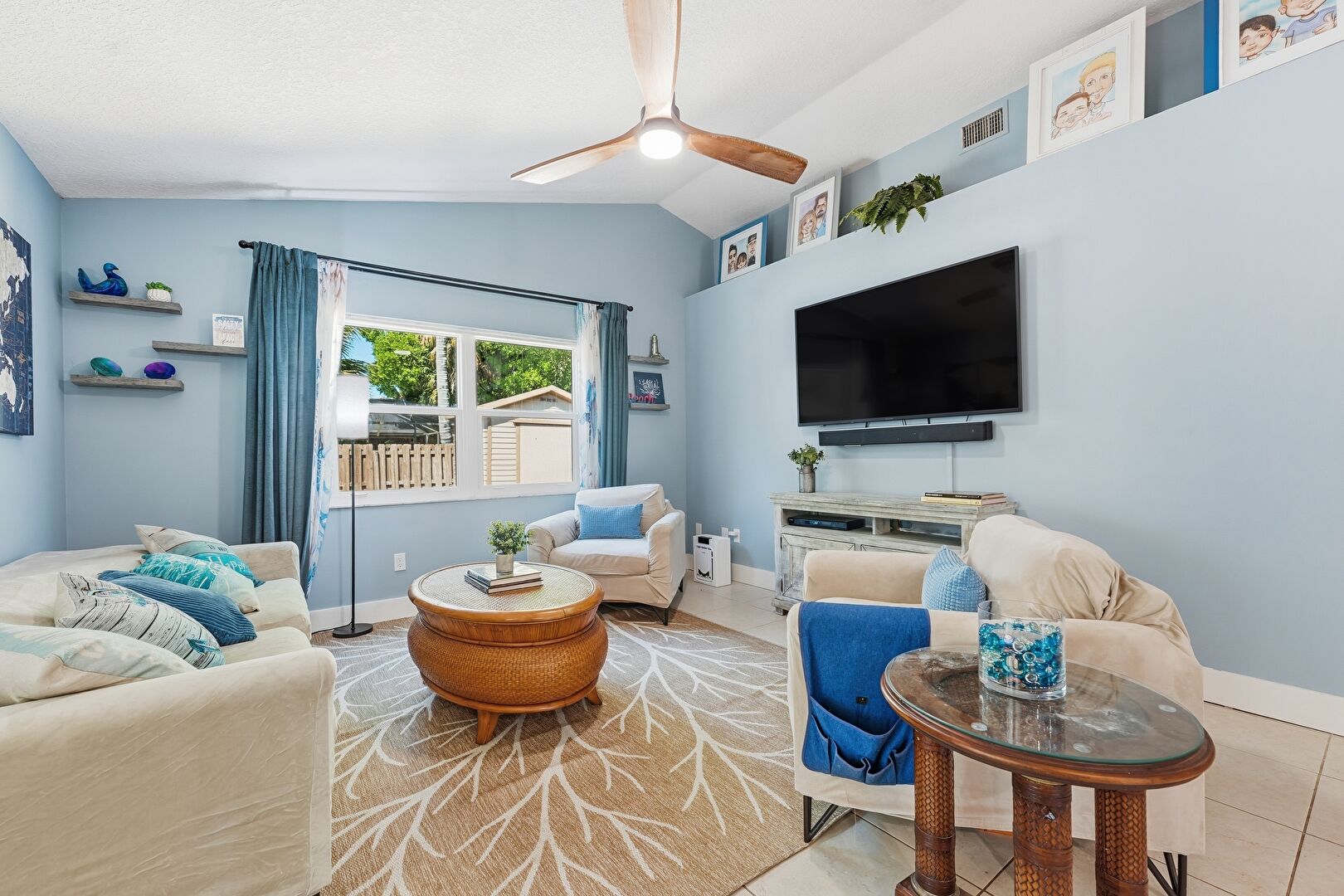Baseboards Wall, Ceiling Fan, Drywall, Tile Floor, Vaulted Ceiling, Wood Finish Floor, Natural Light