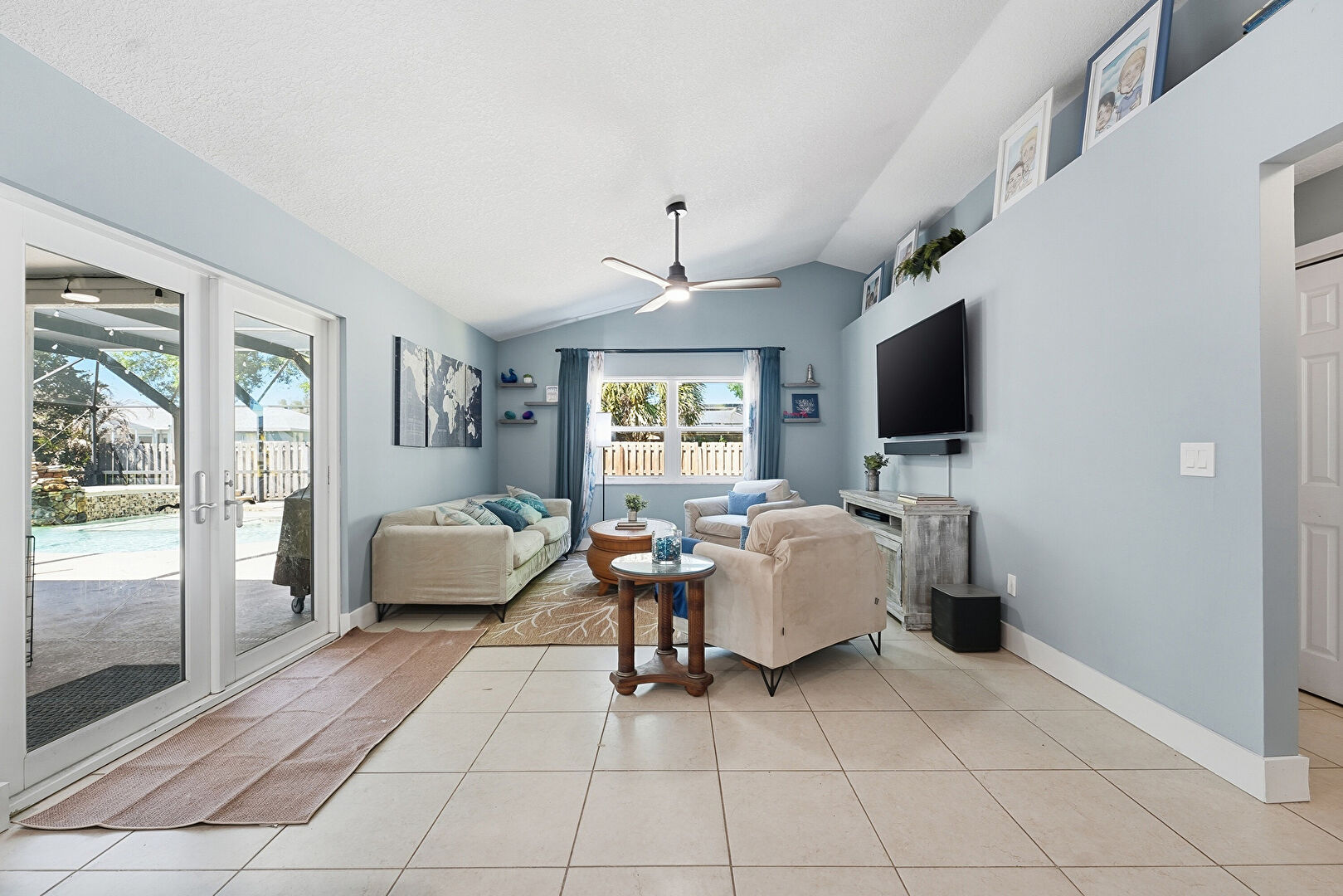 Baseboards Wall, Ceiling Fan, Drywall, French Doors, Natural Light, Recessed Lighting, Tile Floor, Vaulted Ceiling, Vent, Baseboards Wall, Cathedral Ceiling, Ceiling Fan, Drywall
