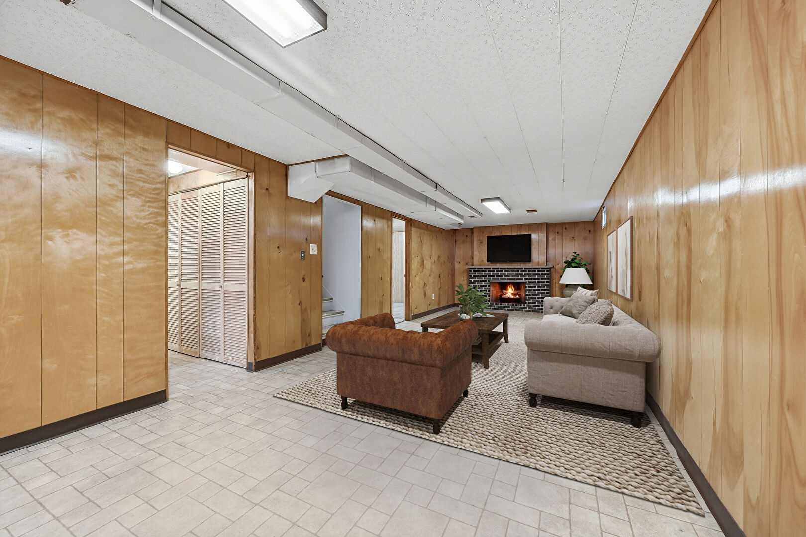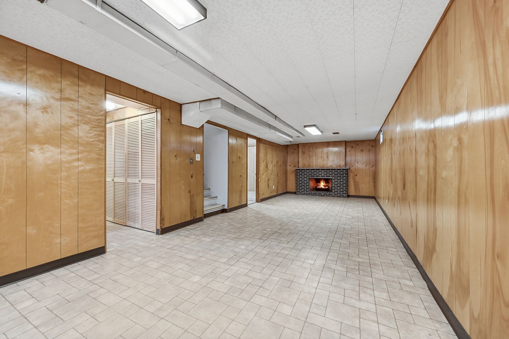 Baseboards Wall, Basement, Fireplace, Stairs, Textured Ceiling, Wood Wall, Brick Finish Floor