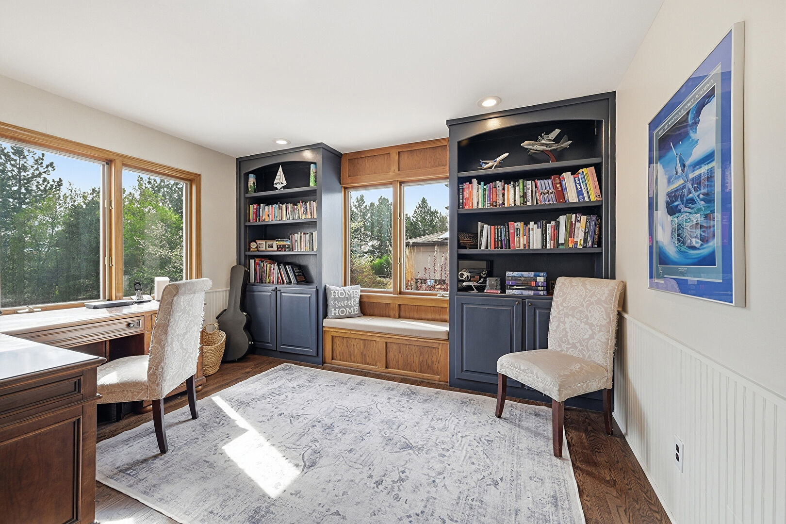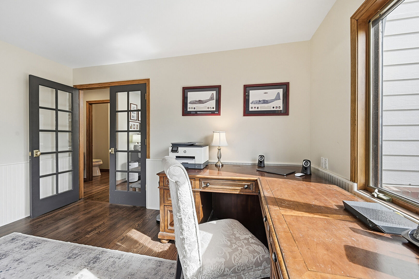 Drywall, French Doors, Natural Light, Office Area, Recessed Lighting, Wainscot Wall, Wood Finish Floor, Built In Shelves, Wainscot Wall