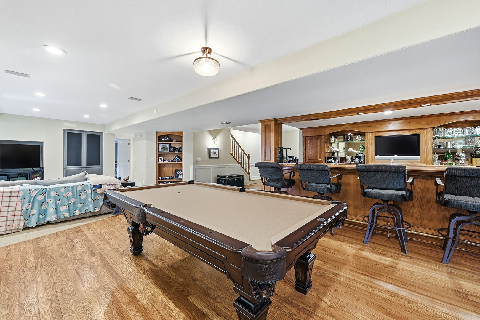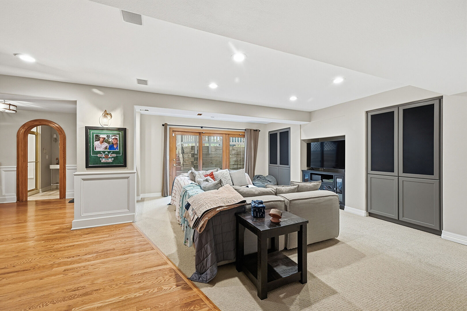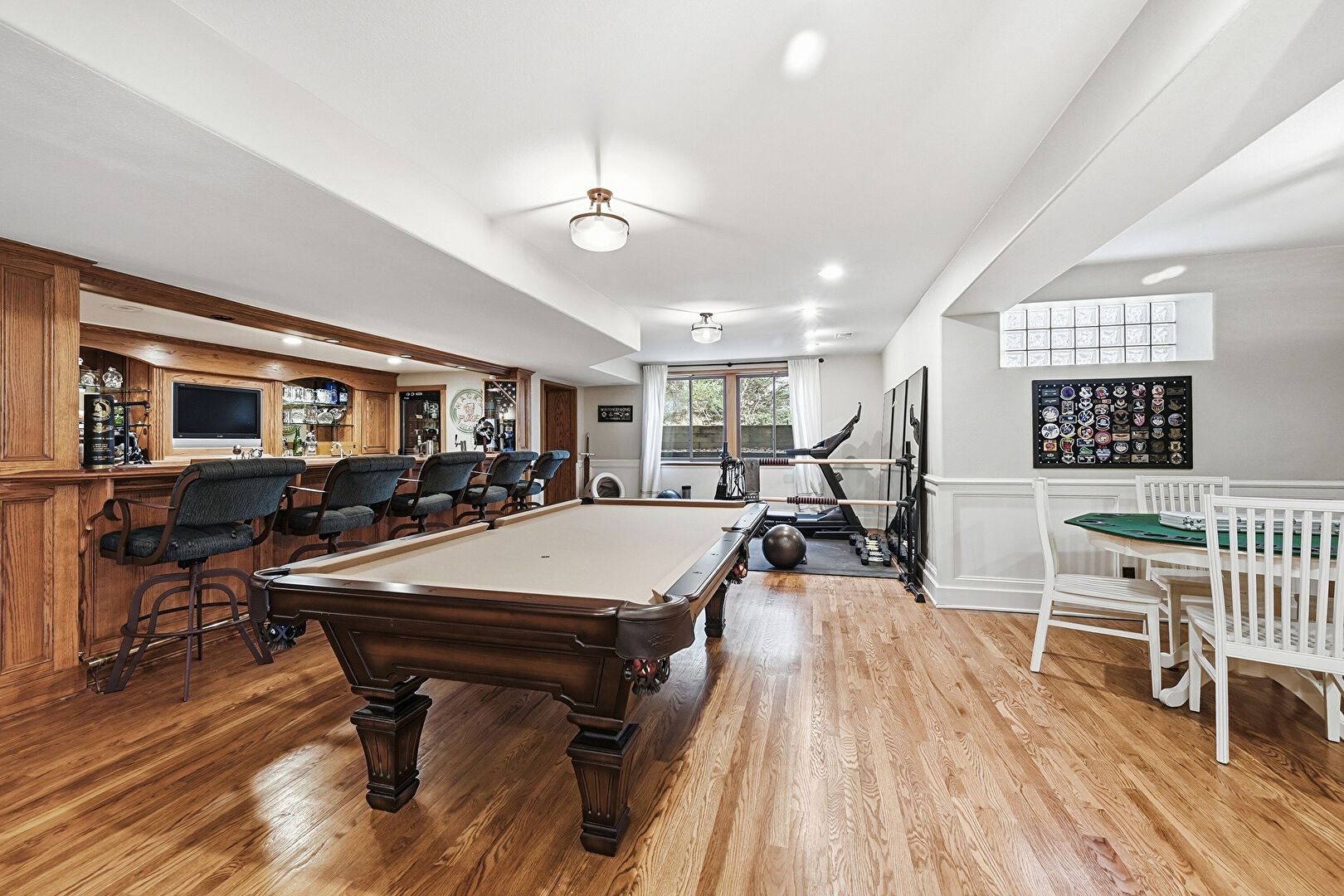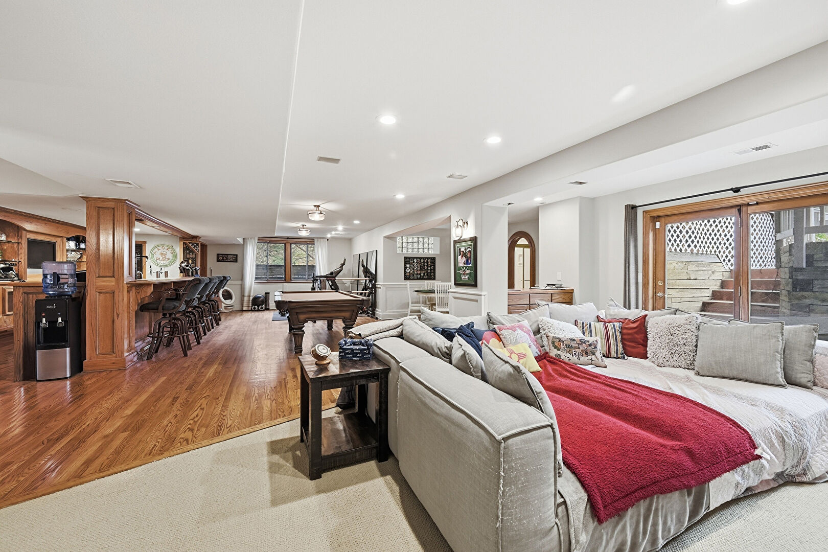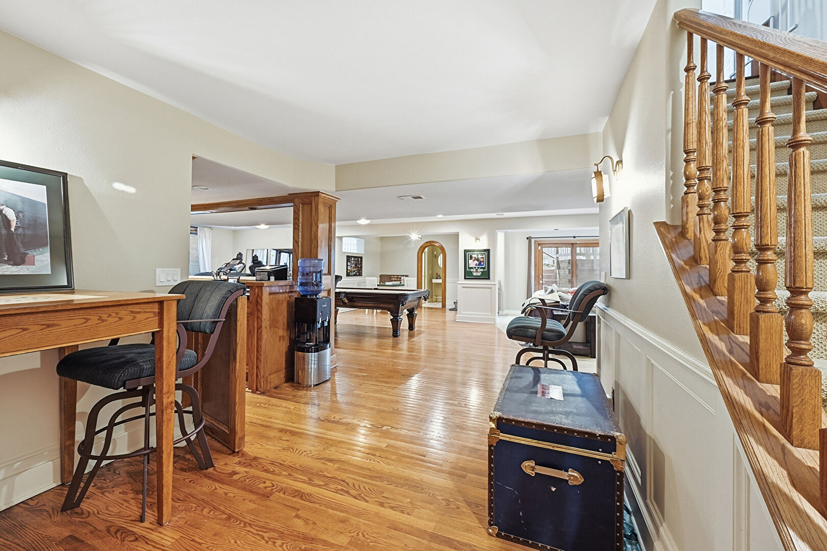 Arched Walkways, Billiards, Built In Shelves, Drywall, Indoor Bar, Natural Light, Paneling Wall, Recessed Lighting, Vent, Wainscot Wall, Wood Finish Floor, Basement, Indoor Bar, Natural Light
