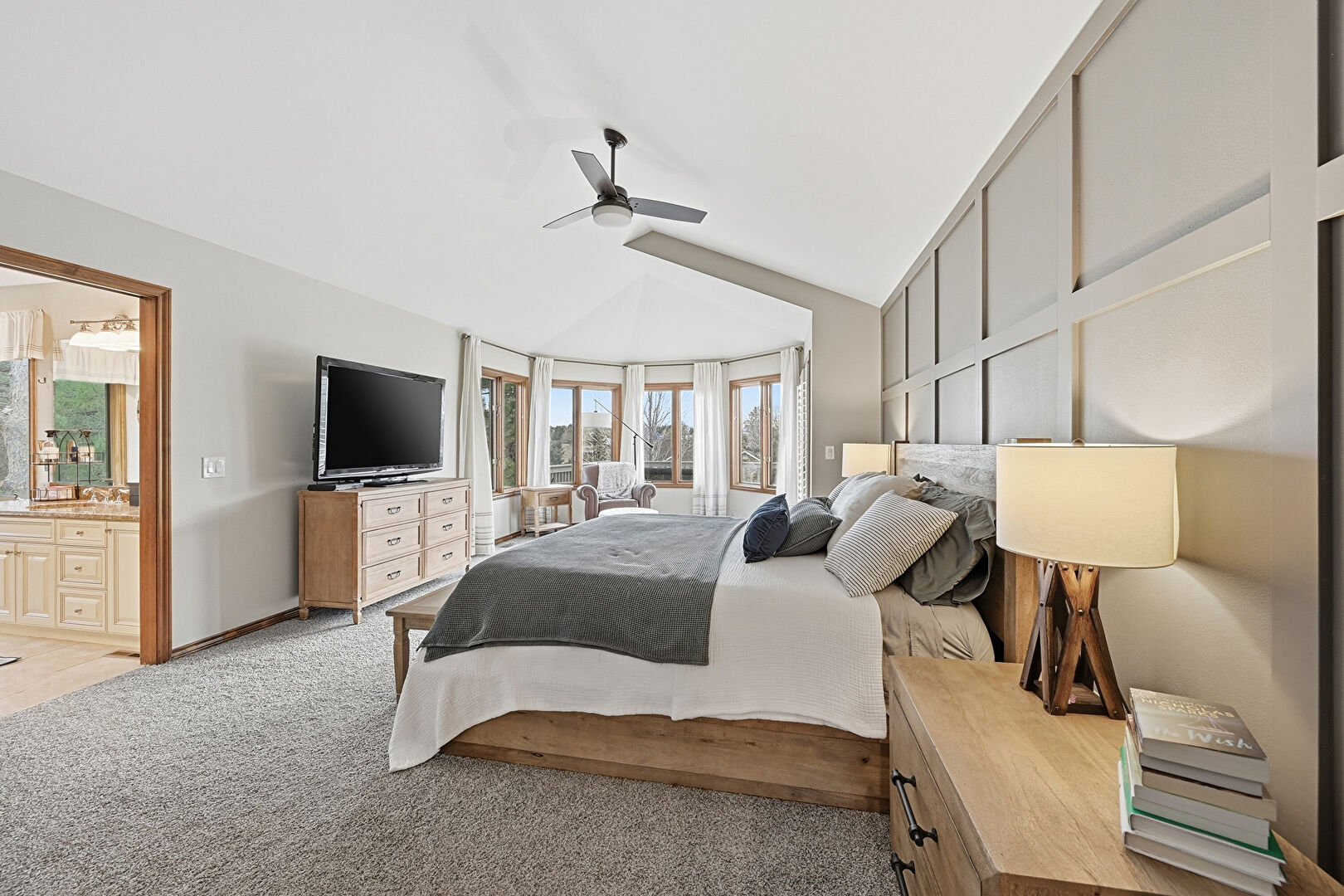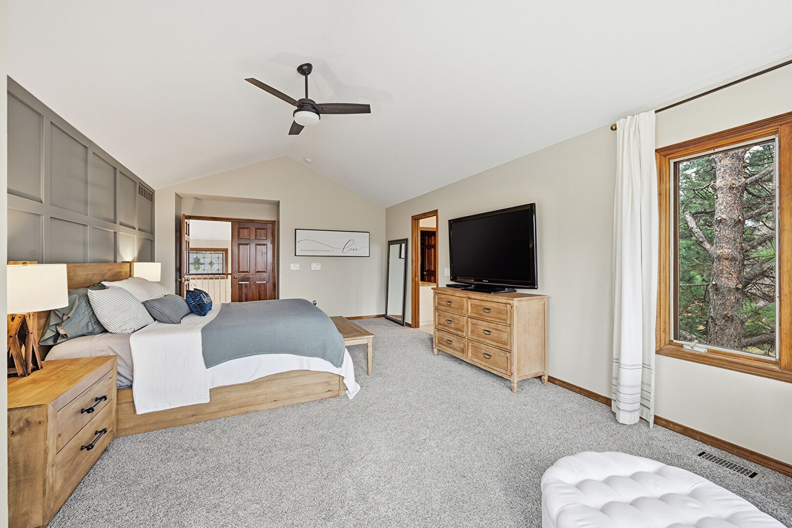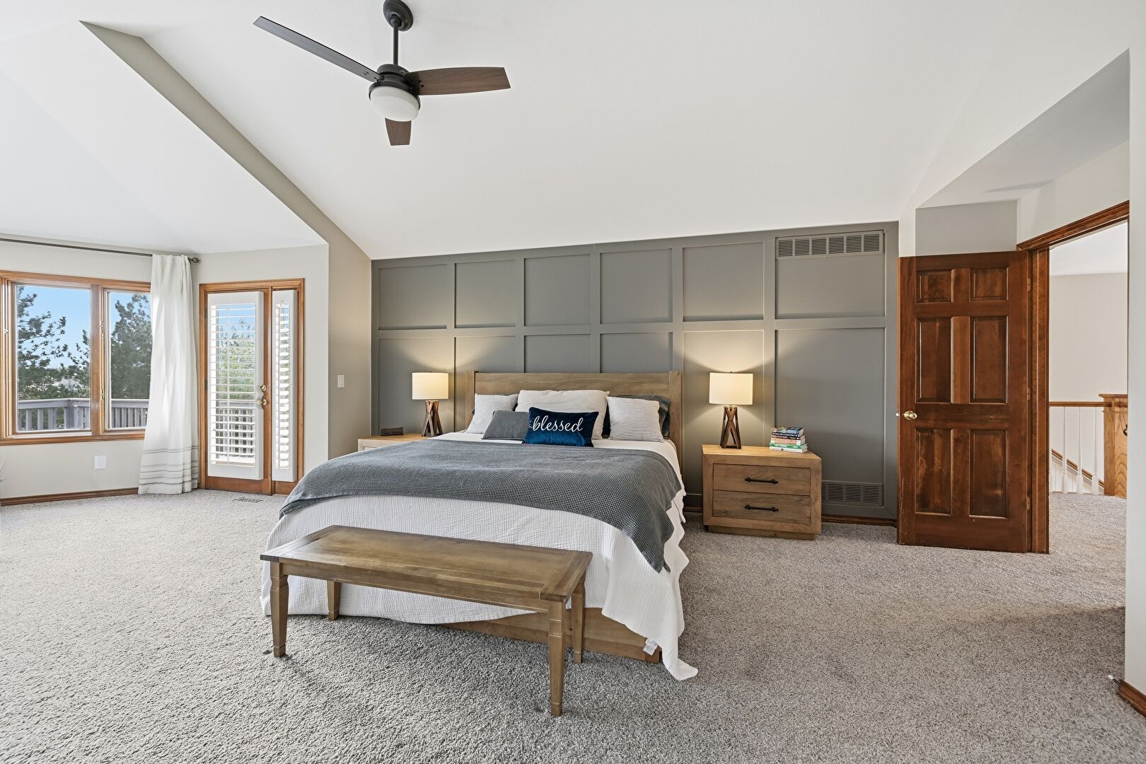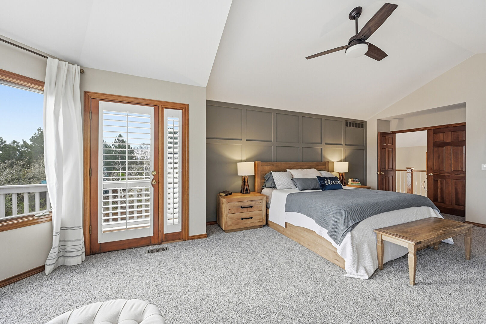 Accent Wall, Access To Exterior, Baseboards Wall, Carpet, Cathedral Ceiling, Ceiling Fan, Drywall, Ensuite Bathroom, High Ceiling, Natural Light, Paneling Wall, Vaulted Ceiling, Vent, Carpet, Ceiling Fan, High Ceiling, Vaulted Ceiling