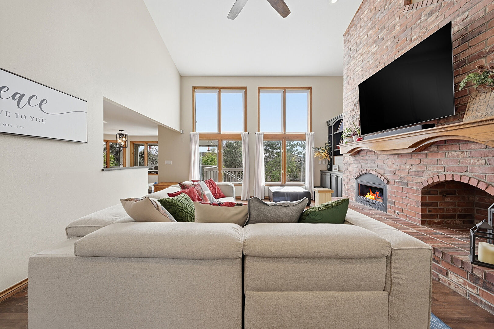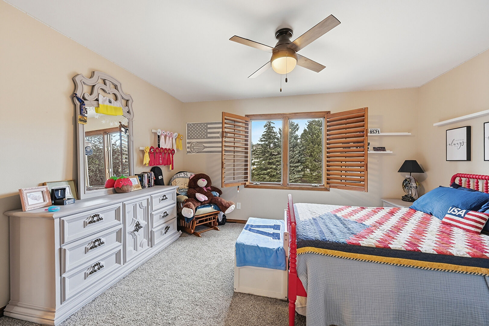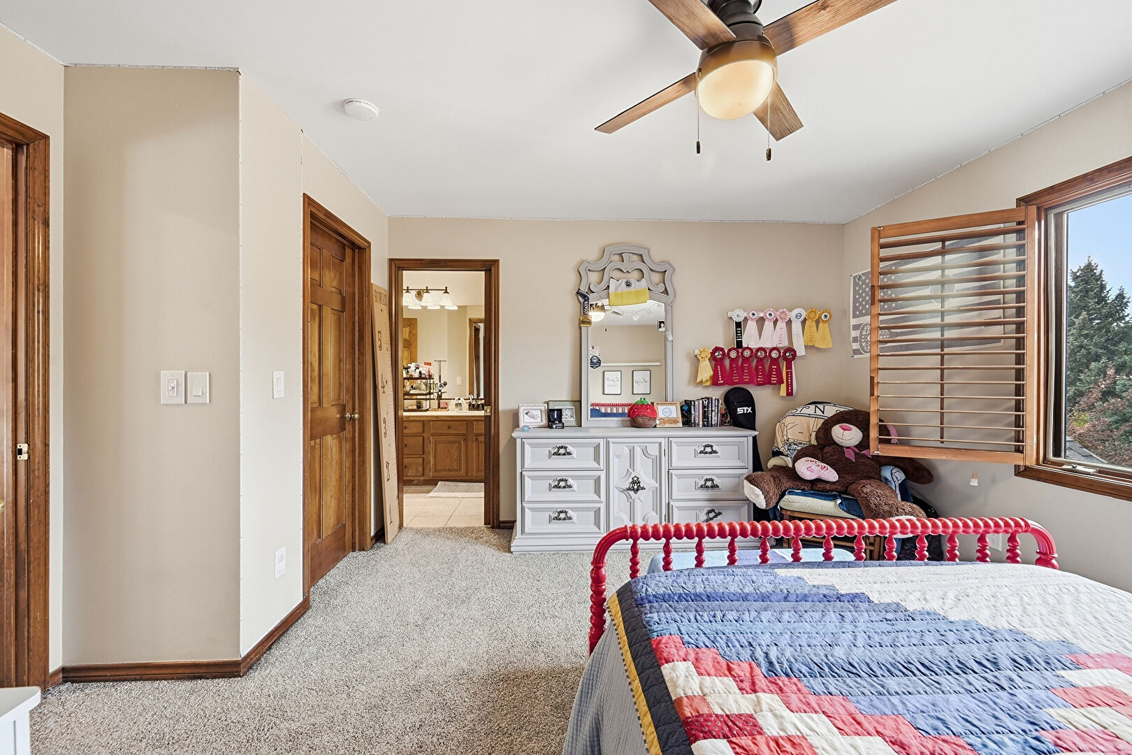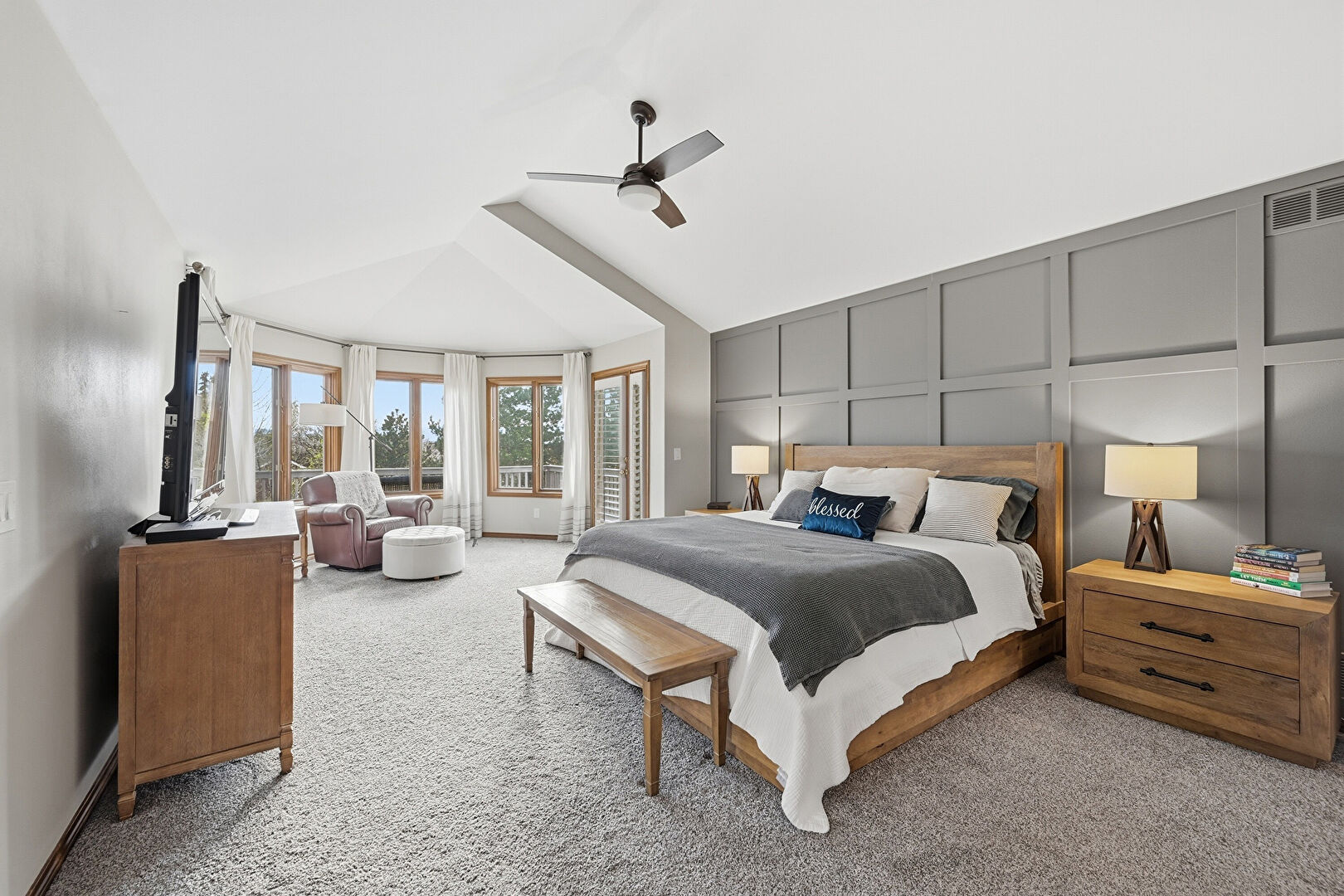 Accent Wall, Access To Exterior, Baseboards Wall, Carpet, Cathedral Ceiling, Ceiling Fan, Drywall, Ensuite Bathroom, High Ceiling, Natural Light, Paneling Wall, Vaulted Ceiling, Vent, Carpet, Ceiling Fan, High Ceiling, Vaulted Ceiling