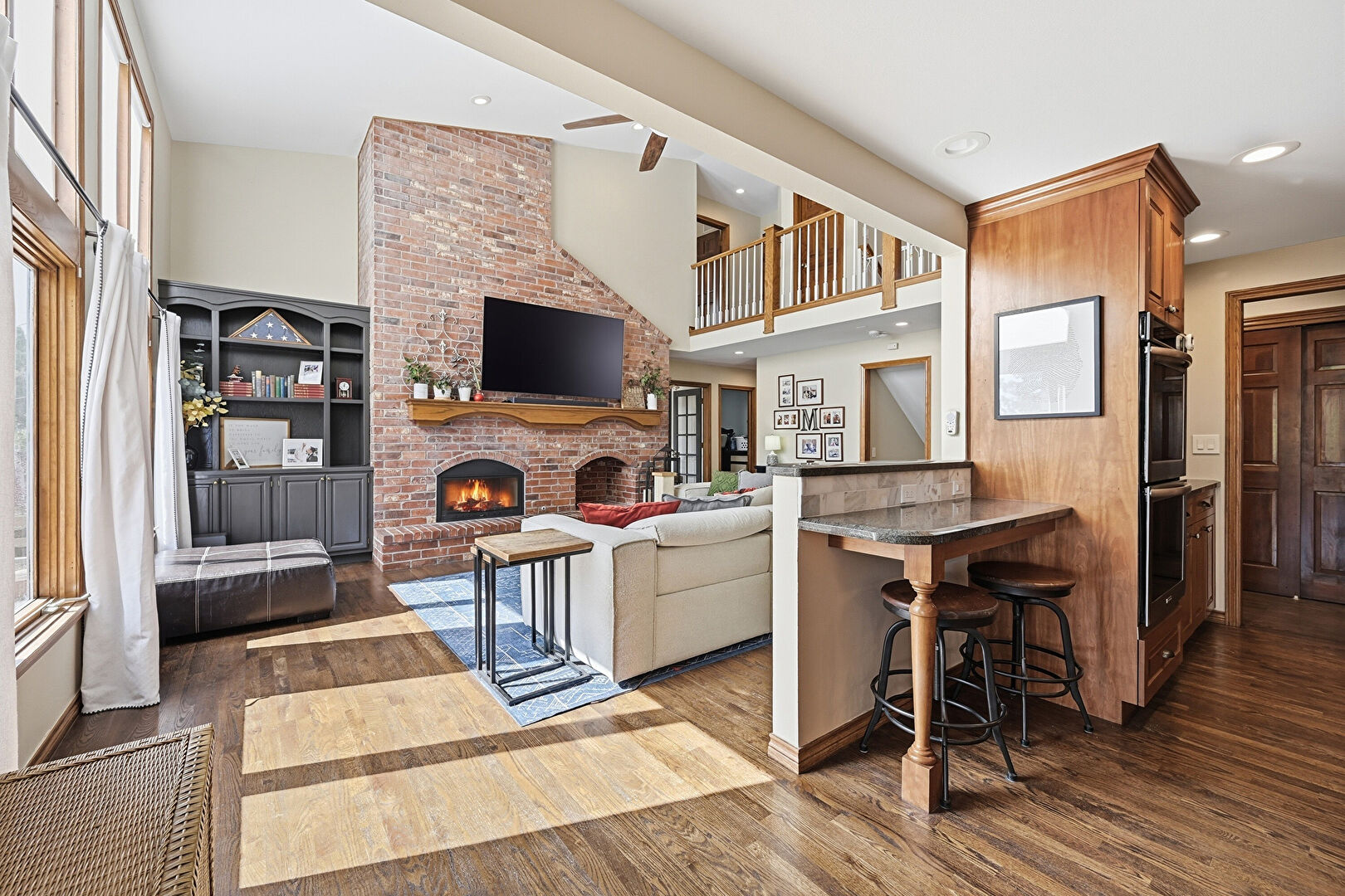 Arched Walkways, Baseboards Wall, Billiards, Carpet, Ceiling Fan, Double Oven, Drywall, Fireplace, High Ceiling, Indoor Bar, Natural Light, Paneling Wall, Recessed Lighting, Stairs, Vaulted Ceiling, Vent, Wainscot Wall, Wood Finish Floor, Built In Shelves, Drywall, High Ceiling, Natural Light, Vaulted Ceiling, Vent