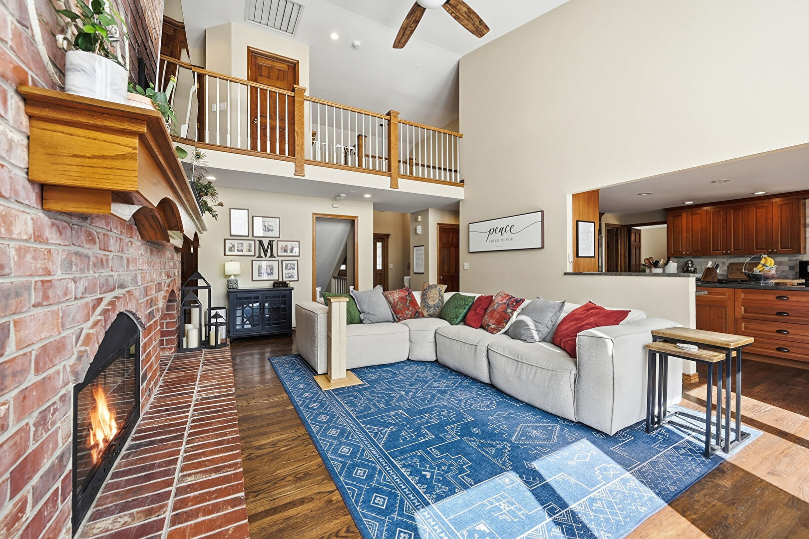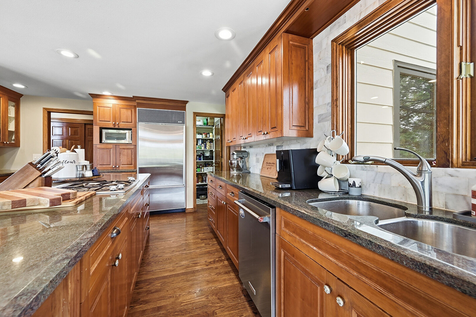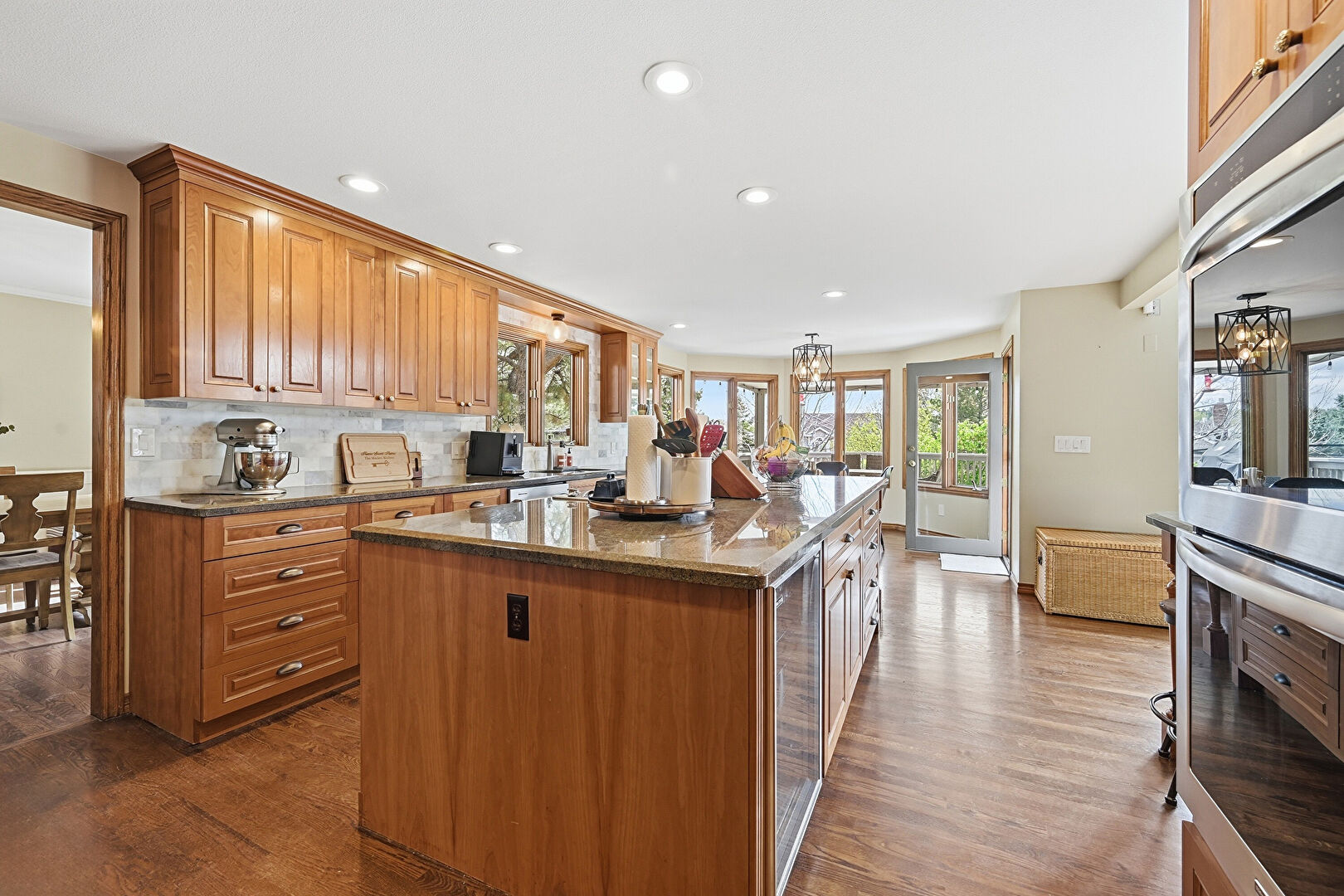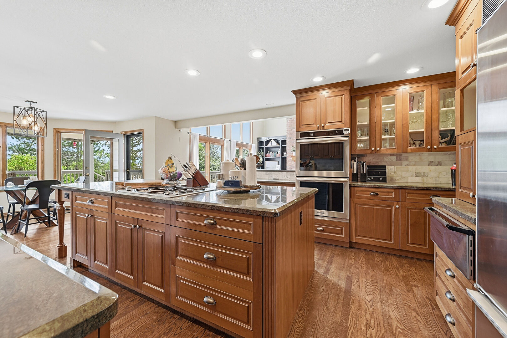 Baseboards Wall, Crown Molding Cabinets, Double Oven, Drywall, Fireplace, Glass Insert Cabinets, Kitchen Bar, Kitchen Island, Kitchen Peninsula, Medium Brown Cabinets, Natural Light, Notable Chandelier, Opens To Living Area, Pass Through Window, Pendant Lighting, Raised Cabinets, Recessed Lighting, Stone Countertops, Toaster, Warming Drawer, Wine Cooler, Wood Finish Floor, Kitchen Bar, Kitchen Island, Pendant Lighting, Recessed Lighting, Wood Finish Floor
