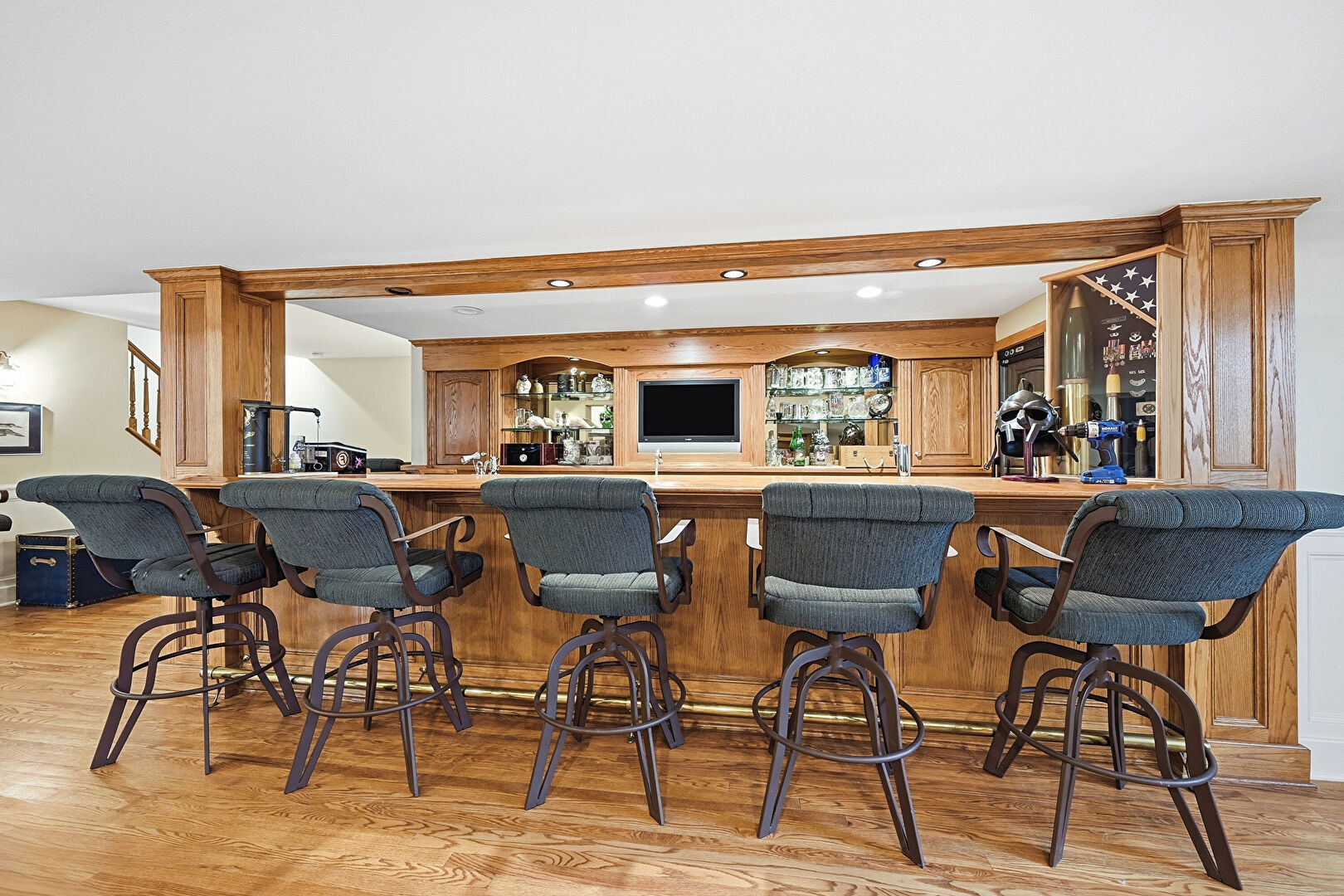 Baseboards Wall, Butcher Block Countertops, Drywall, Indoor Bar, Medium Brown Cabinets, Open Shelves, Recessed Lighting, Stairs, Wood Finish Floor, Crown Molding Cabinets