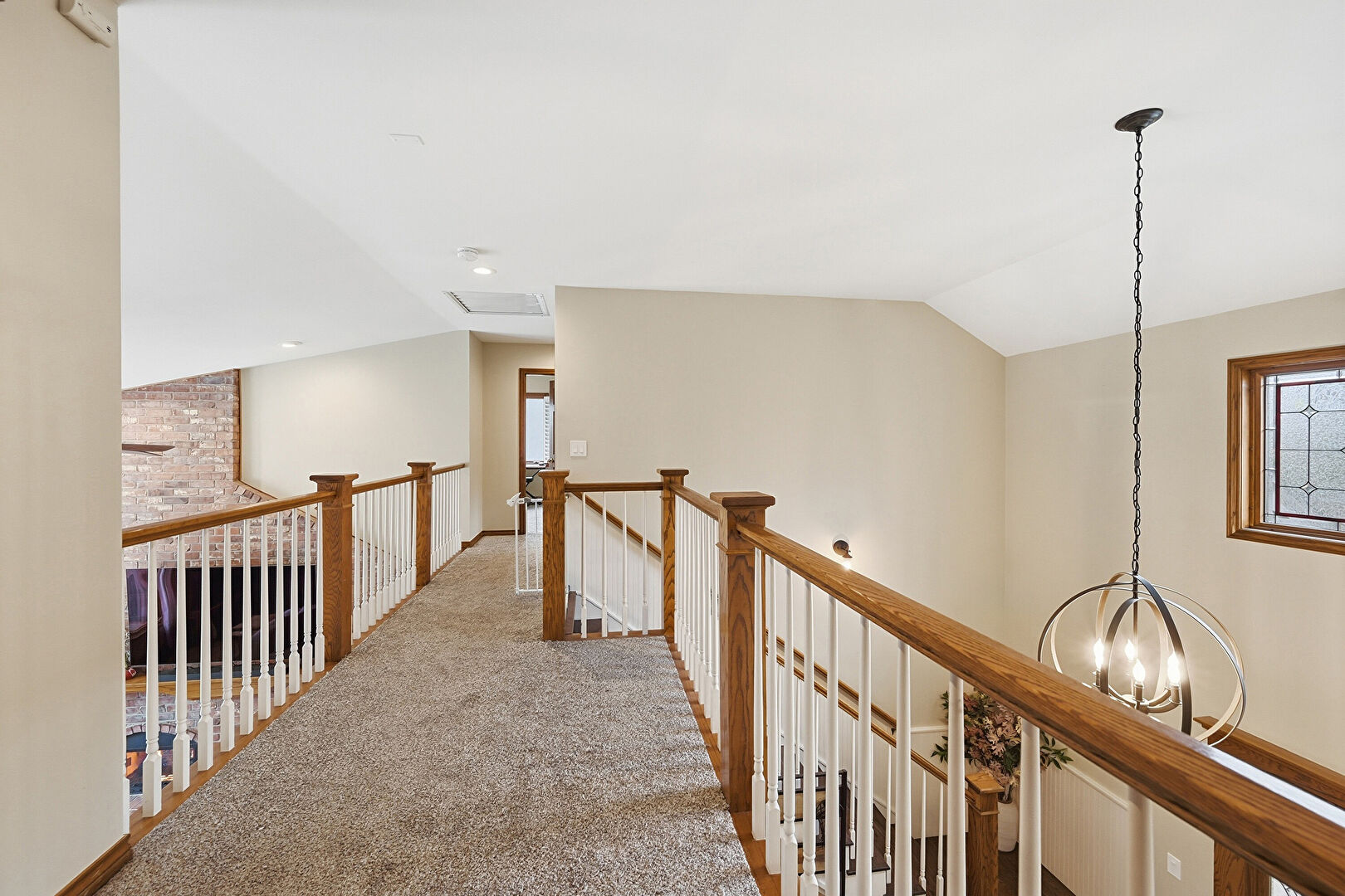 Carpet, Drywall, Natural Light, Notable Chandelier, Recessed Lighting, Upstairs Landing, Vaulted Ceiling, Vent, Baseboards Wall, Carpet
