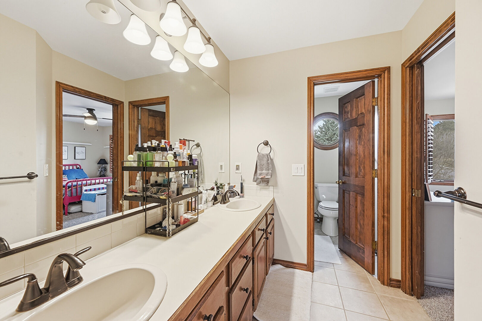 Baseboards Wall, Double Vanity, Drywall, Ensuite Bathroom, Full Bathroom, Natural Light, Recessed Lighting, Tile Floor, Vanity, Vent, Water Closet, Baseboards Wall, Ceiling Fan, Drywall, Full Bathroom