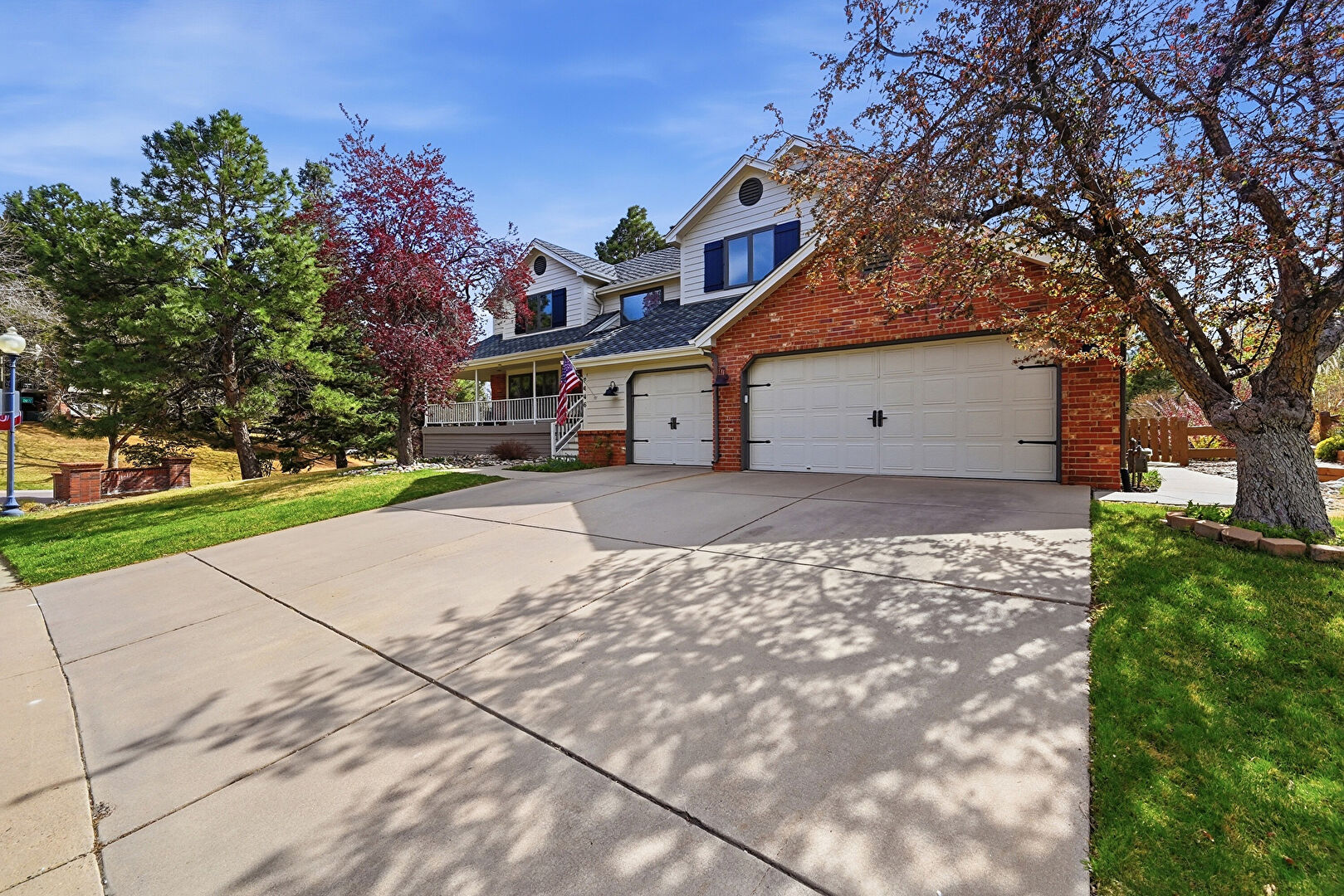 Brick Siding, Built In Garage, Downspout, Driveway, Gutters, Horizontal Siding, Lawn, Porch, Shingle Roof, Stairs, Brick Siding, Downspout, Driveway