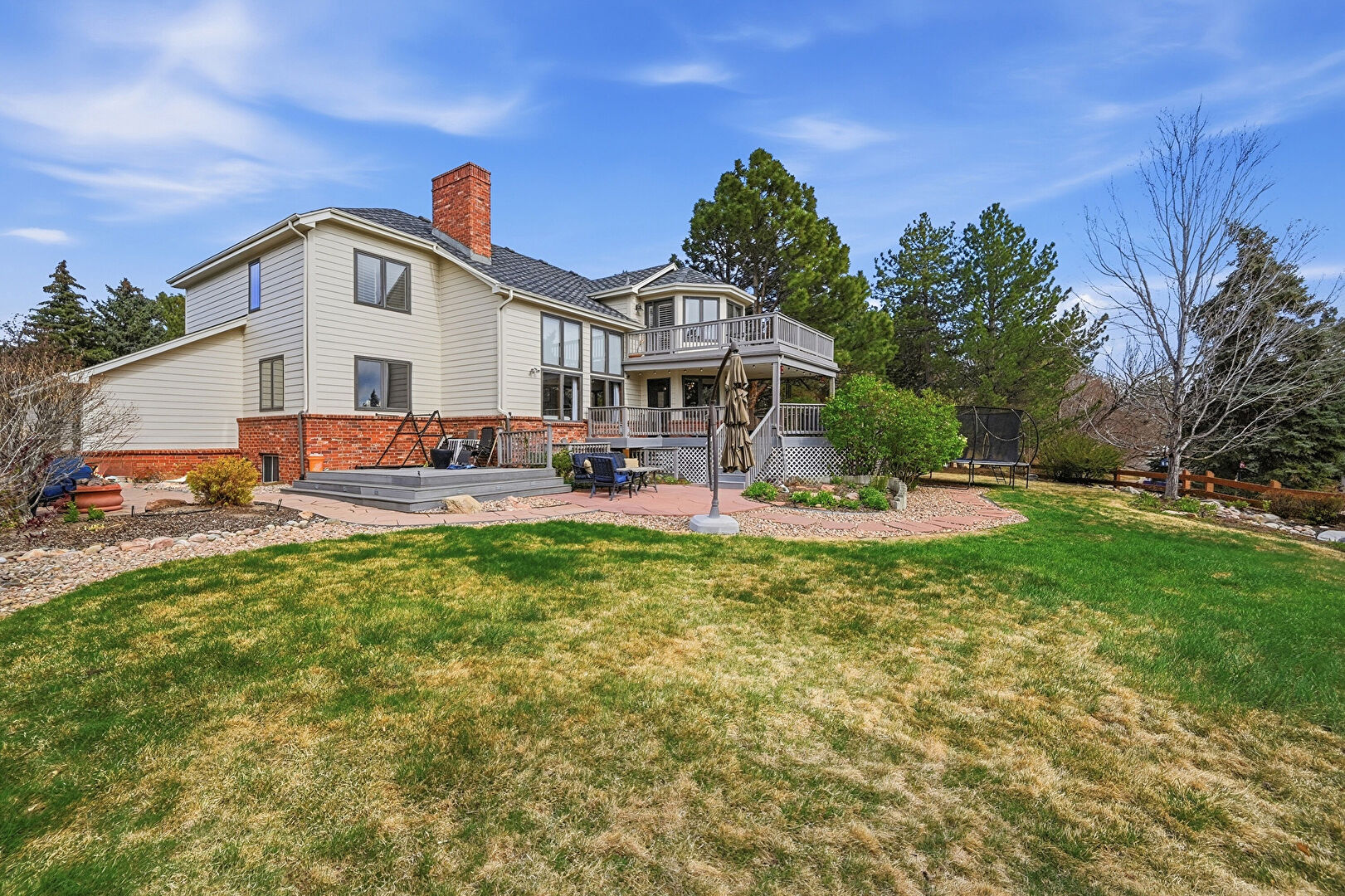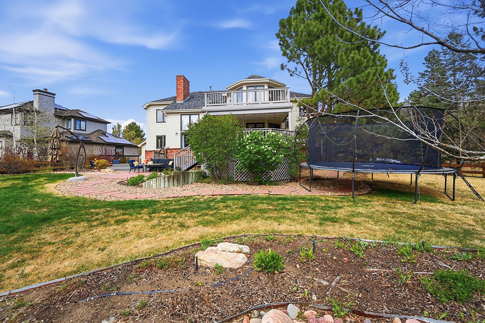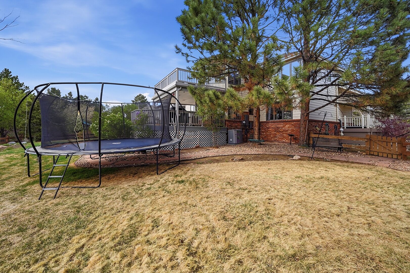 Brick Siding, Central Ac, Chimney, Deck, Downspout, Fence, Gutters, Horizontal Siding, Lawn, Patio, Stairs, Trampoline, Balcony, Deck, Fence