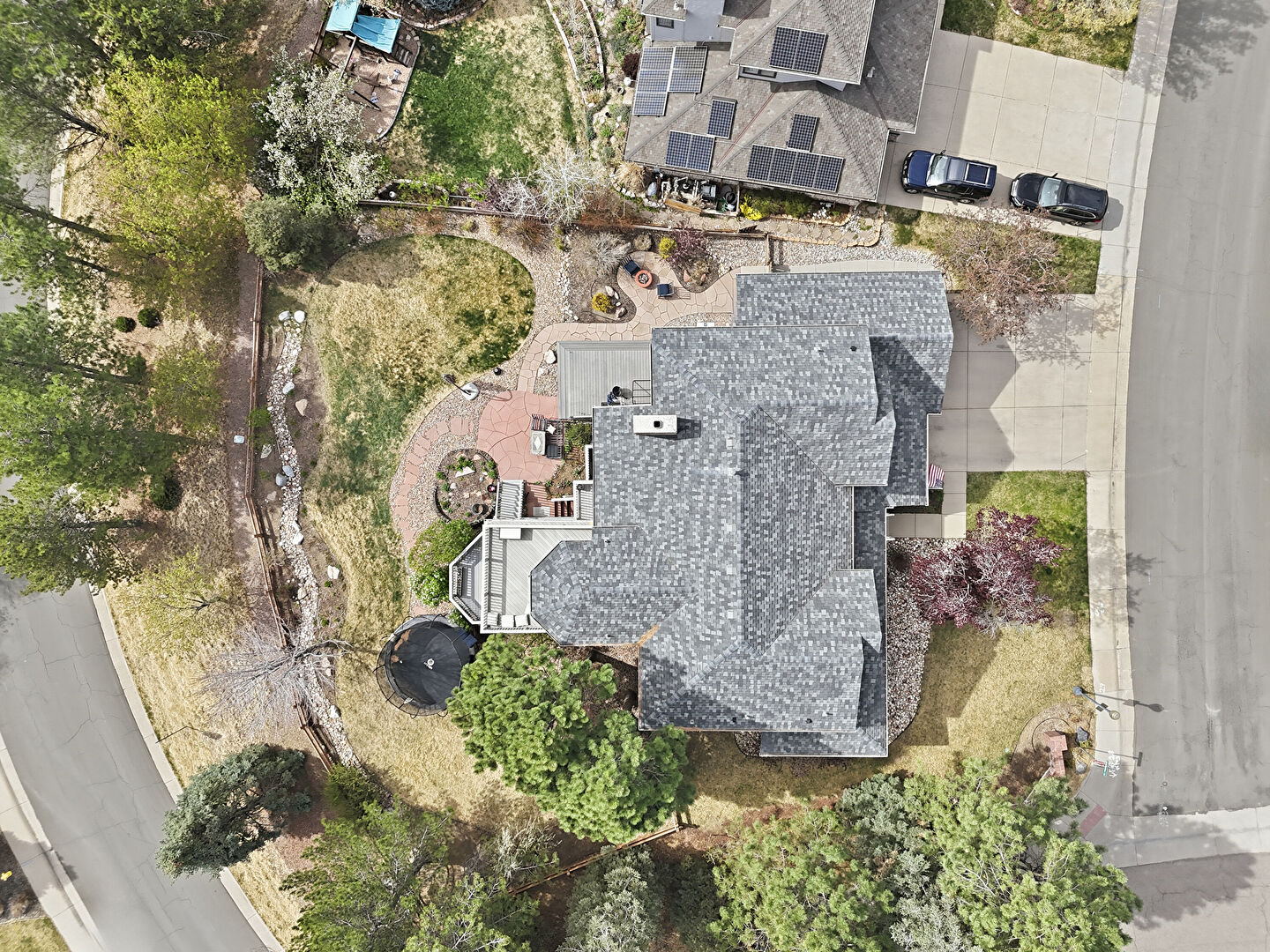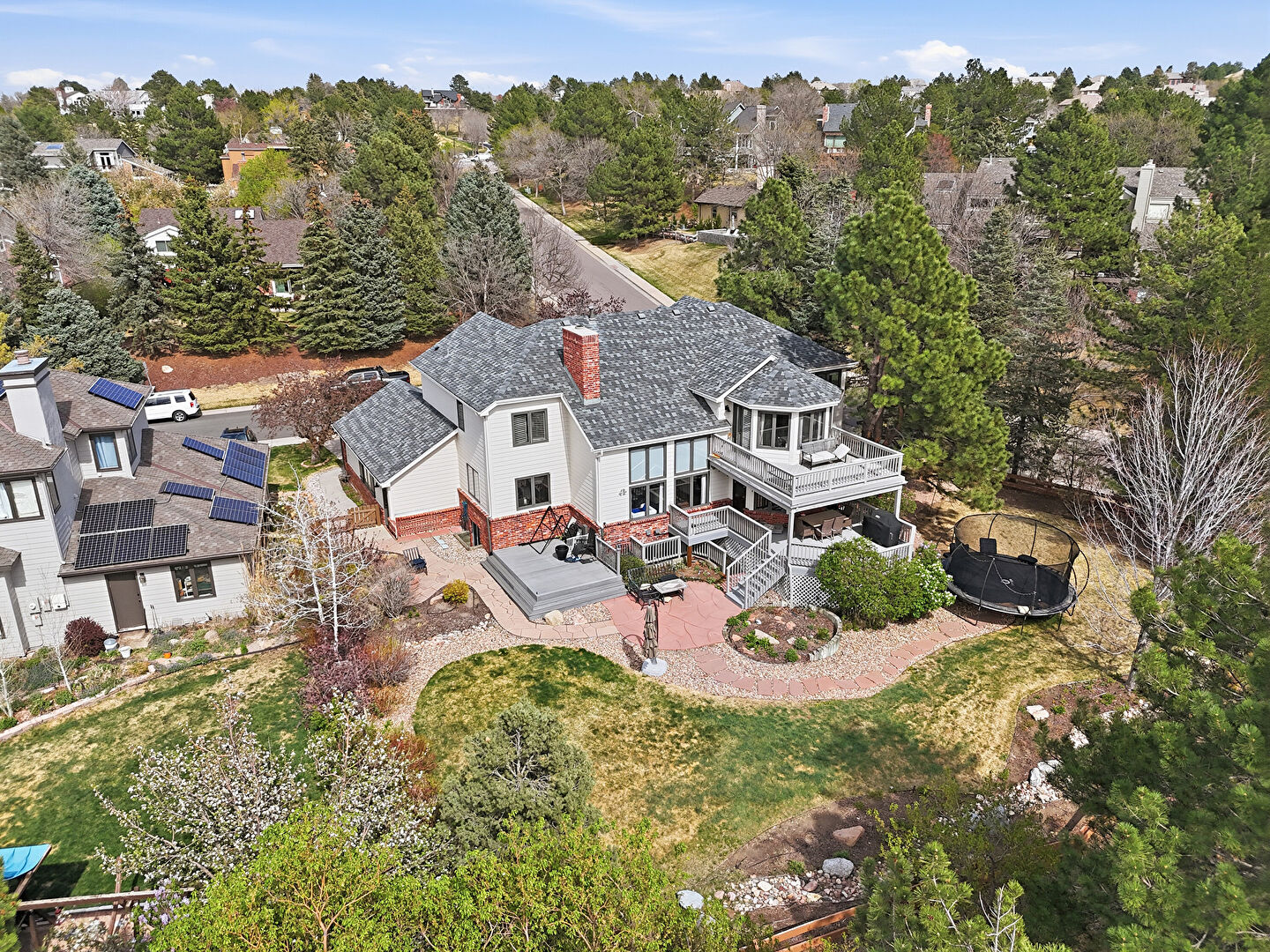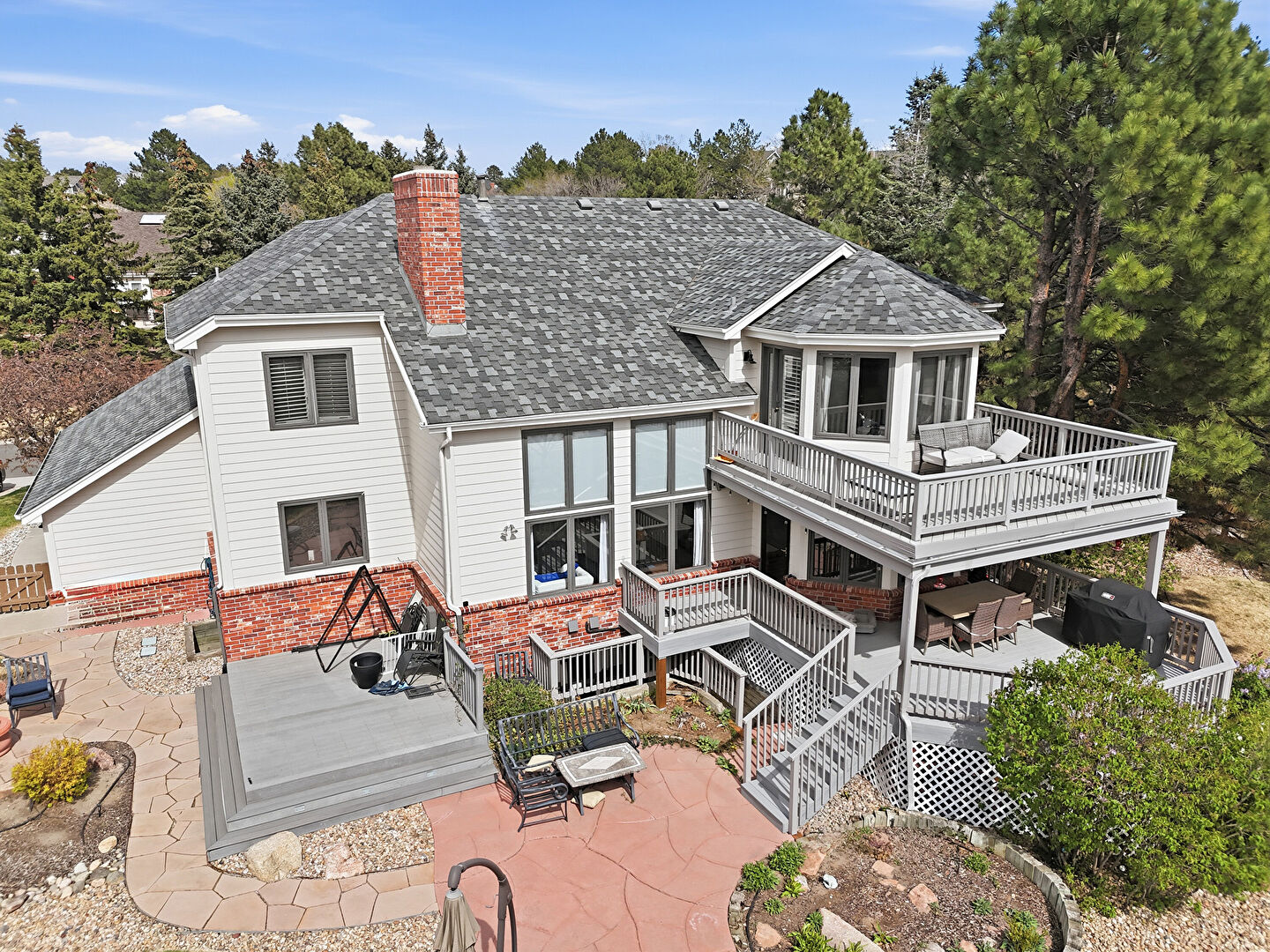 Brick Siding, Central Ac, Chimney, Deck, Downspout, Fence, Gutters, Horizontal Siding, Lawn, Patio, Stairs, Trampoline, Balcony, Deck, Fence
