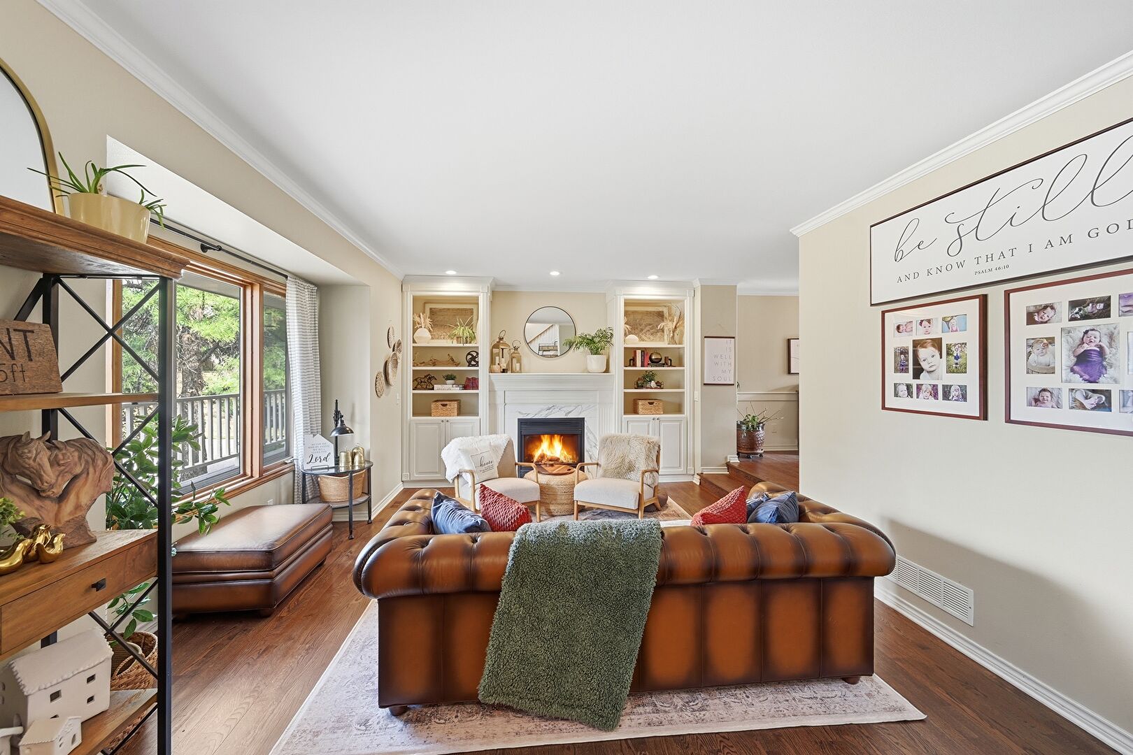 Baseboards Wall, Built In Shelves, Crown Molding, Drywall, Fireplace, Natural Light, Recessed Lighting, Stairs, Vent, Wood Finish Floor, Baseboards Wall, Natural Light