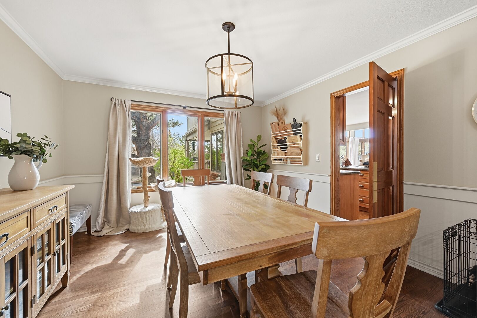 Baseboards Wall, Crown Molding, Drywall, Natural Light, Notable Chandelier, Paneling Wall, Recessed Lighting, Wainscot Wall, Wood Finish Floor, Natural Light, Notable Chandelier
