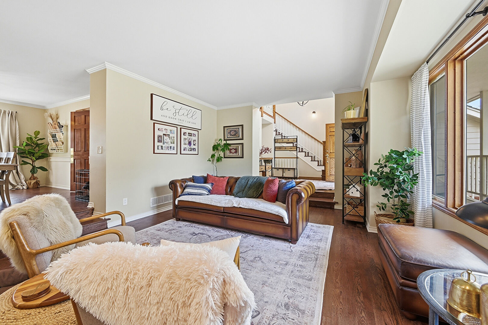 Baseboards Wall, Crown Molding, Drywall, High Ceiling, Natural Light, Stairs, Wood Finish Floor, Baseboards Wall, Vent