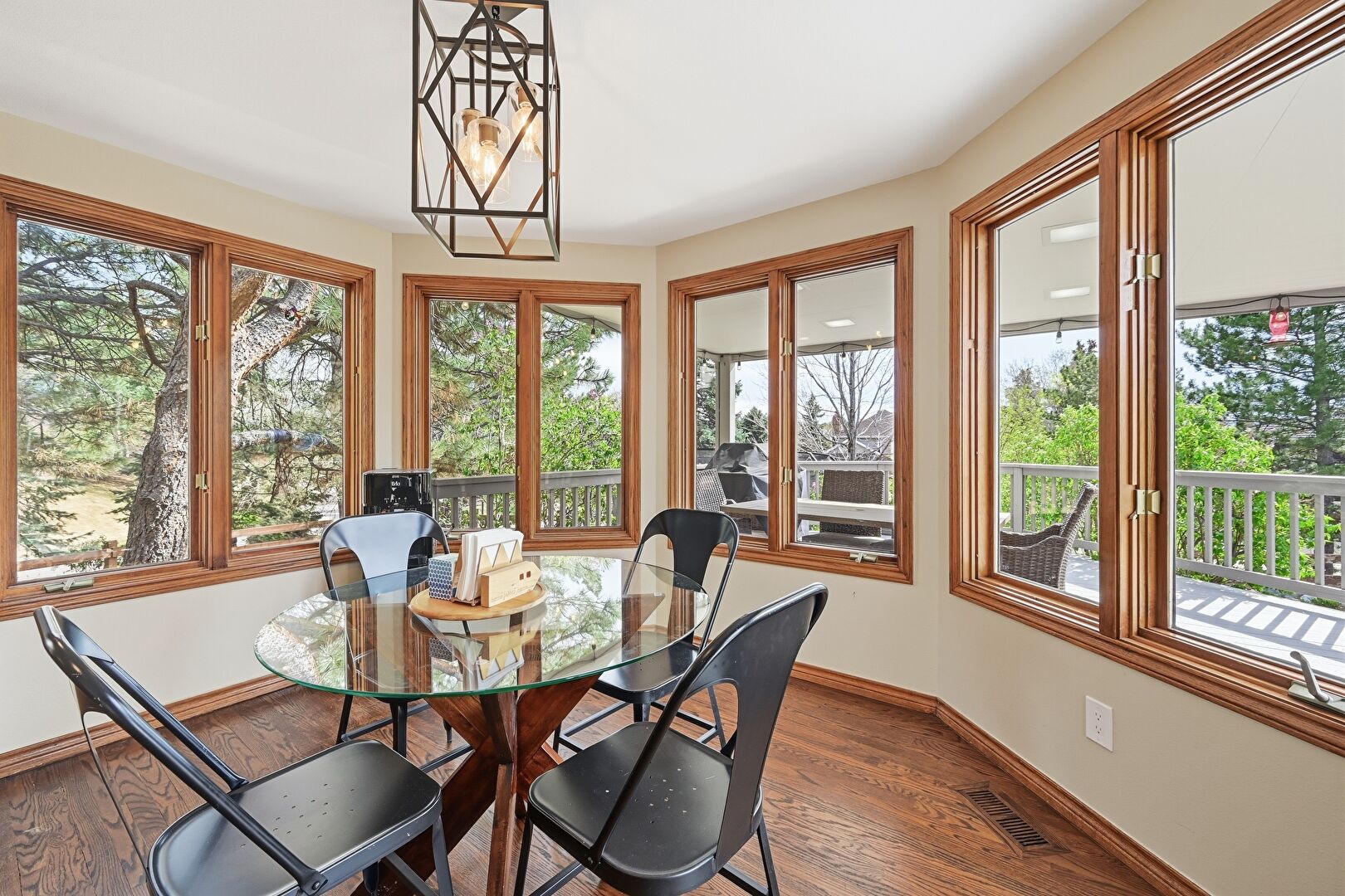 Baseboards Wall, Drywall, Notable Chandelier, Sunroom, Vent, Wood Finish Floor, Natural Light