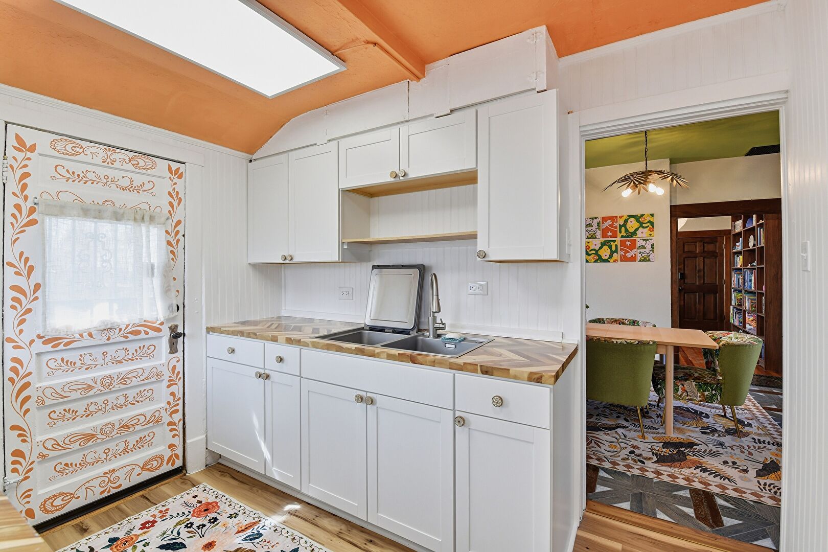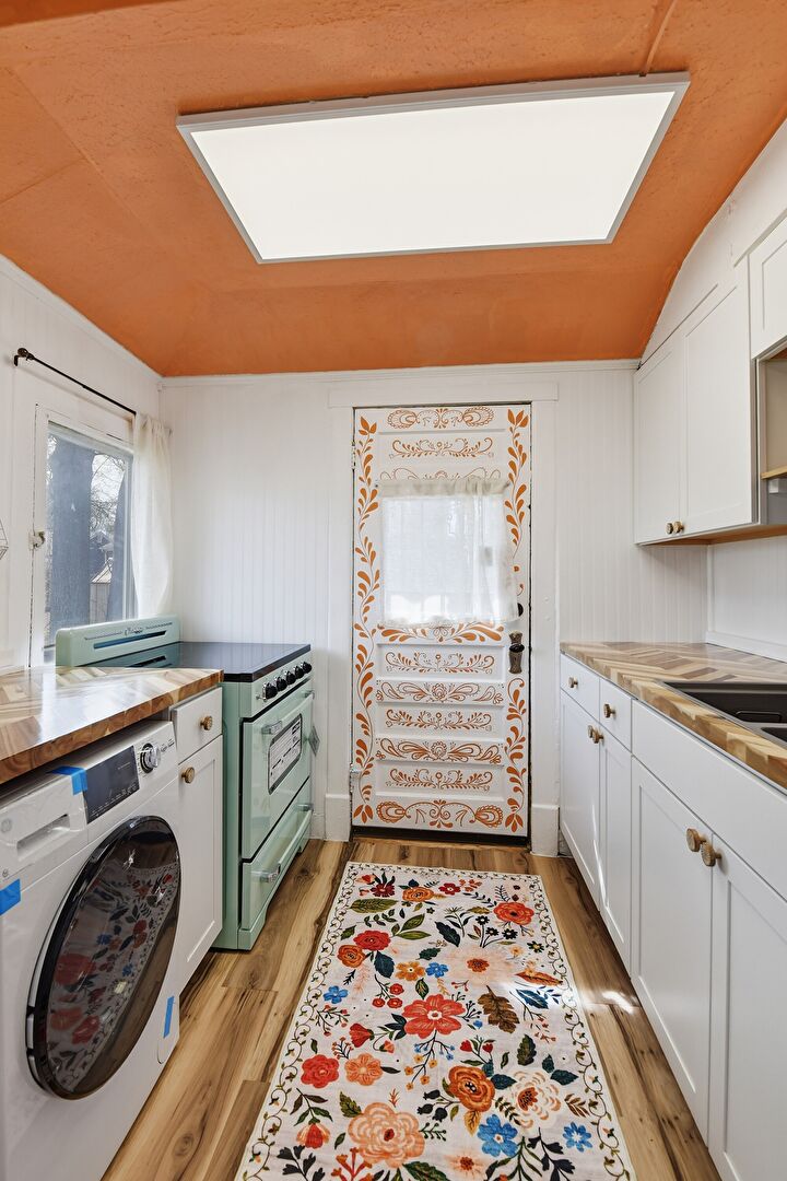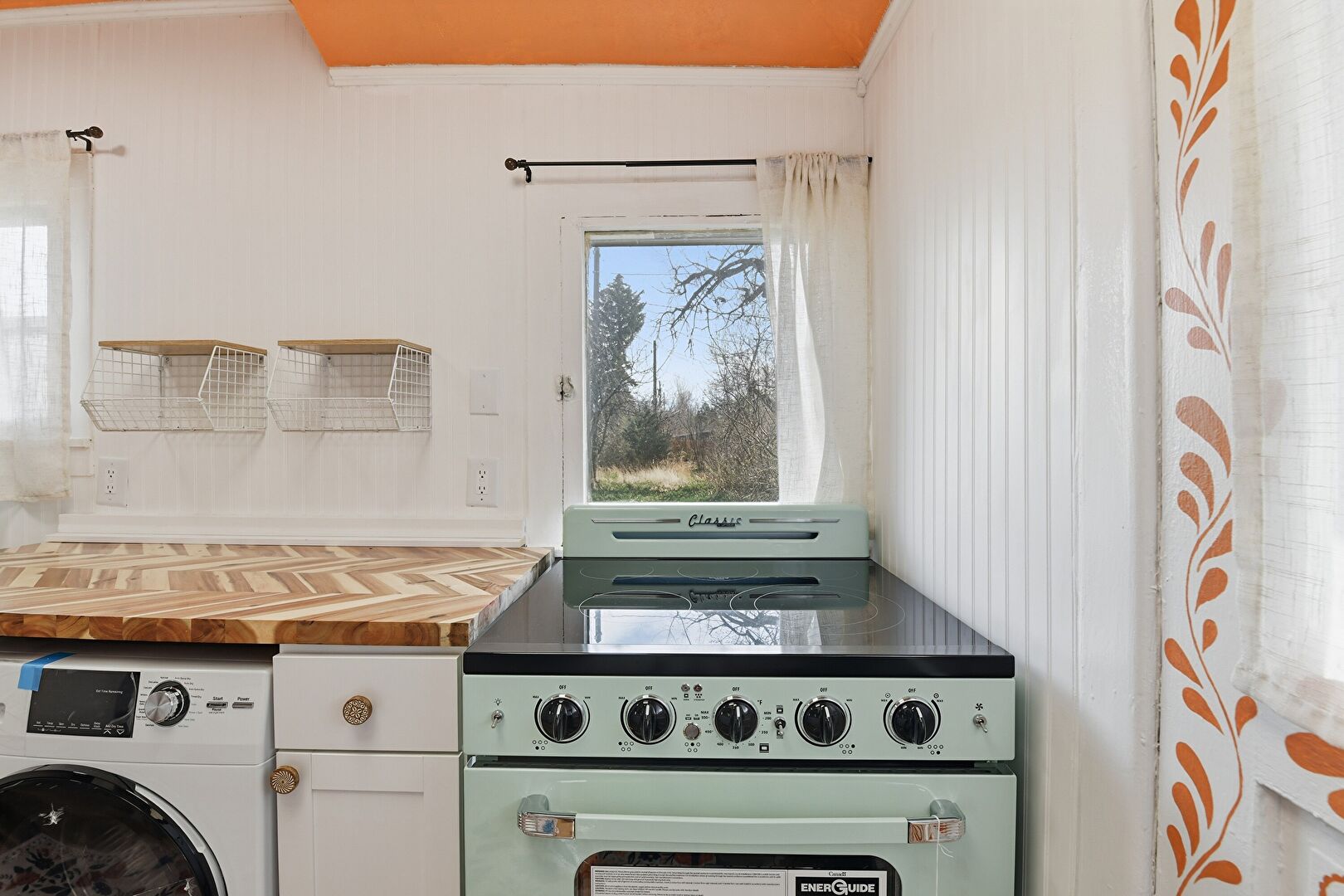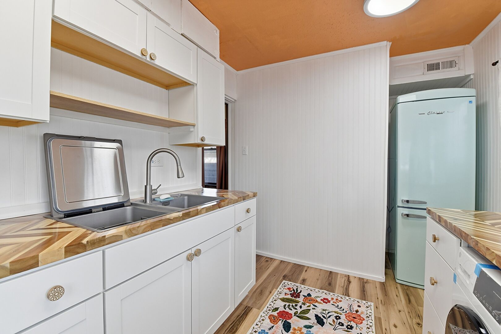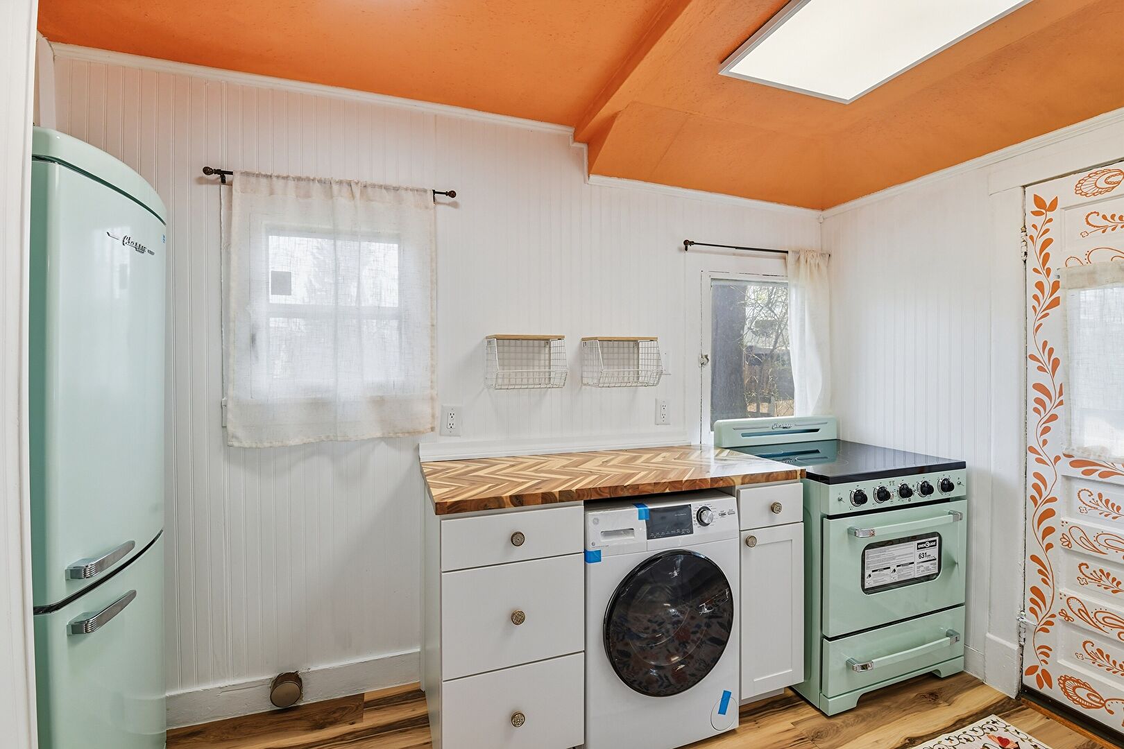Baseboards Wall, Butcher Block Countertops, Crown Molding, Laundry, Natural Light, Open Shelves, Shaker Cabinets, Vaulted Ceiling, Vent, Washer Dryer, Wood Finish Floor, Wood Wall, Butcher Block Countertops, Ceiling Fan, Crown Molding, Laundry, Wood Wall