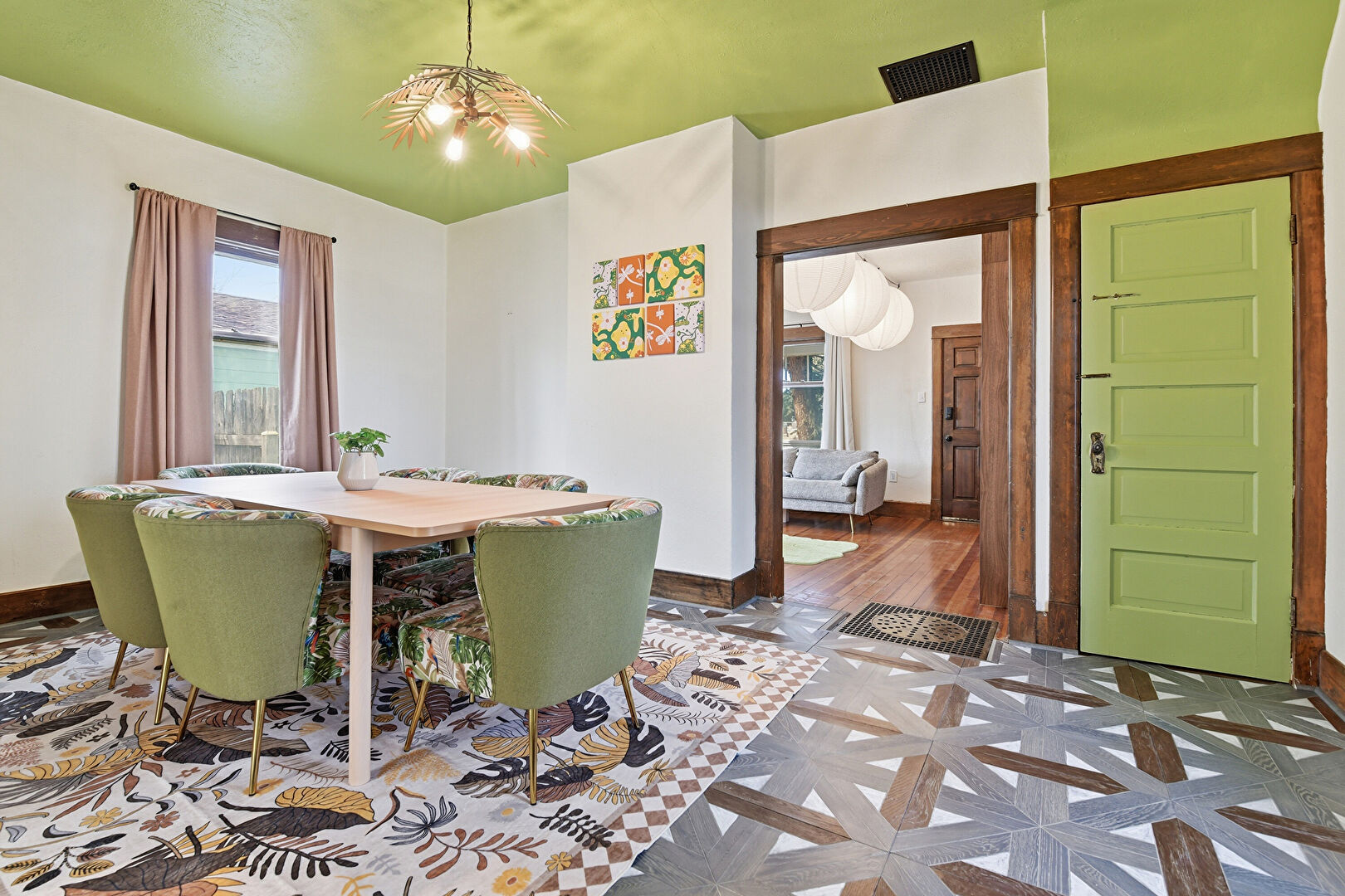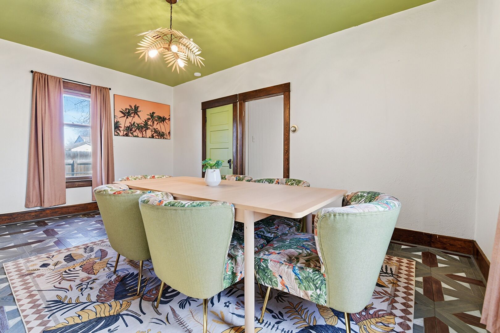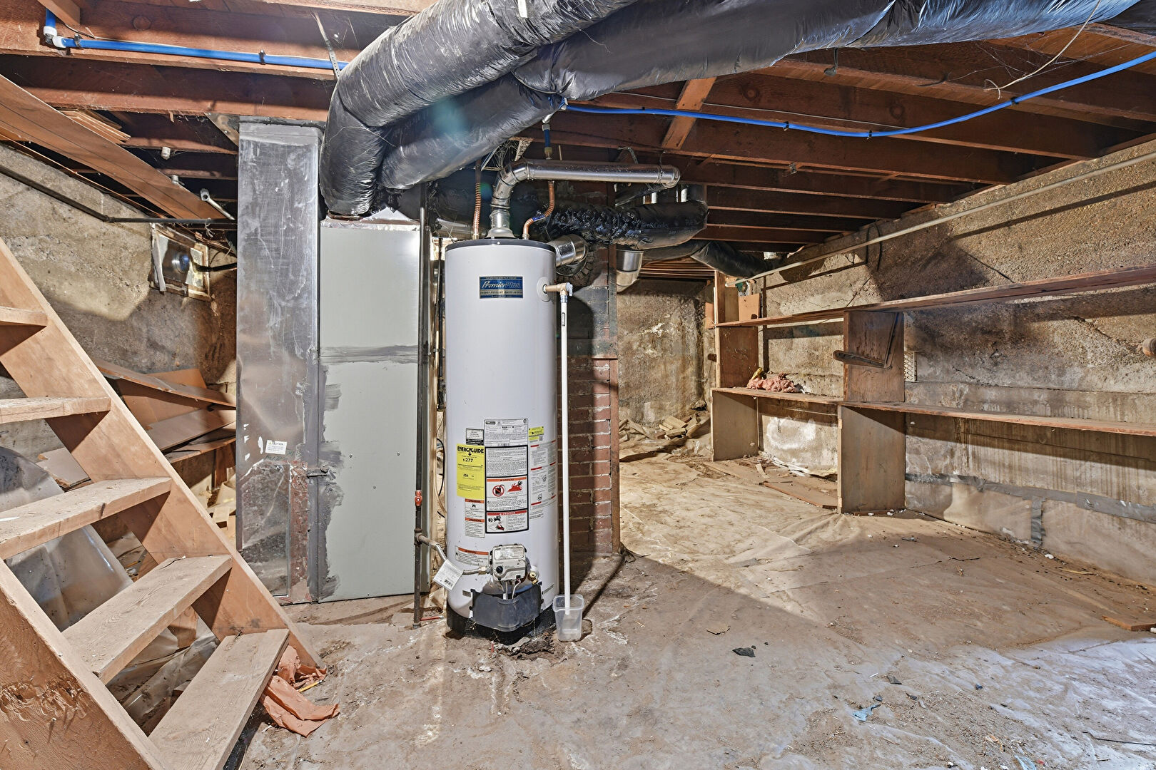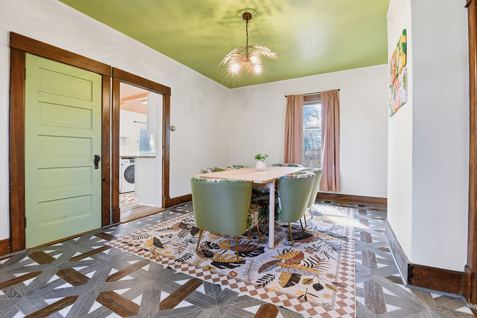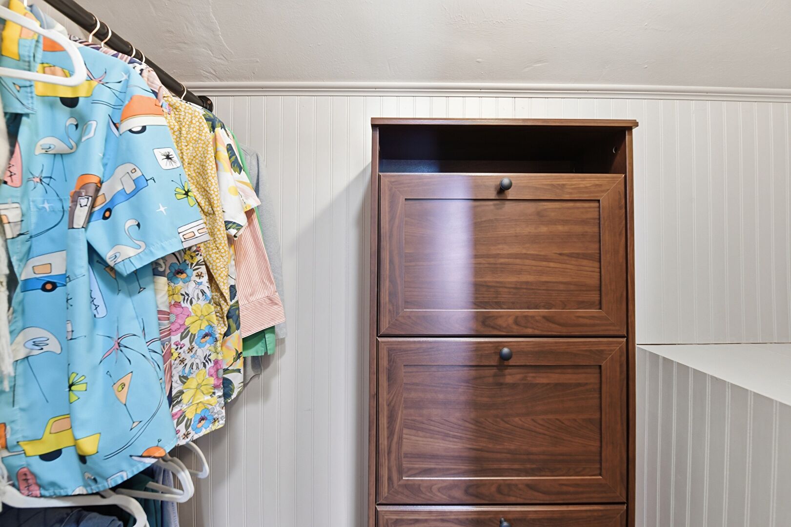 Baseboards Wall, Butcher Block Countertops, Crown Molding, Laundry, Natural Light, Open Shelves, Shaker Cabinets, Vaulted Ceiling, Vent, Washer Dryer, Wood Finish Floor, Wood Wall, Butcher Block Countertops, Ceiling Fan, Crown Molding, Laundry, Wood Wall