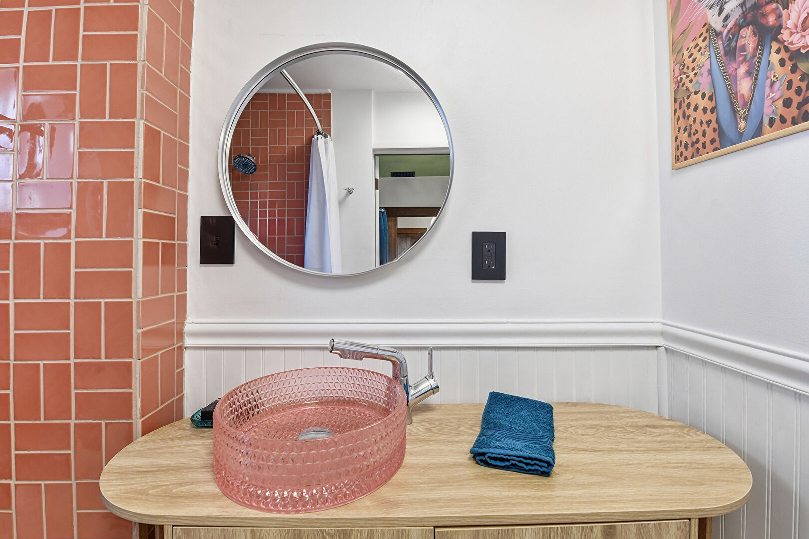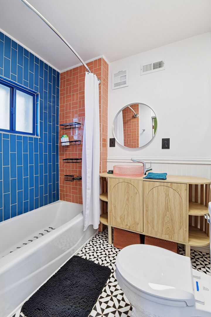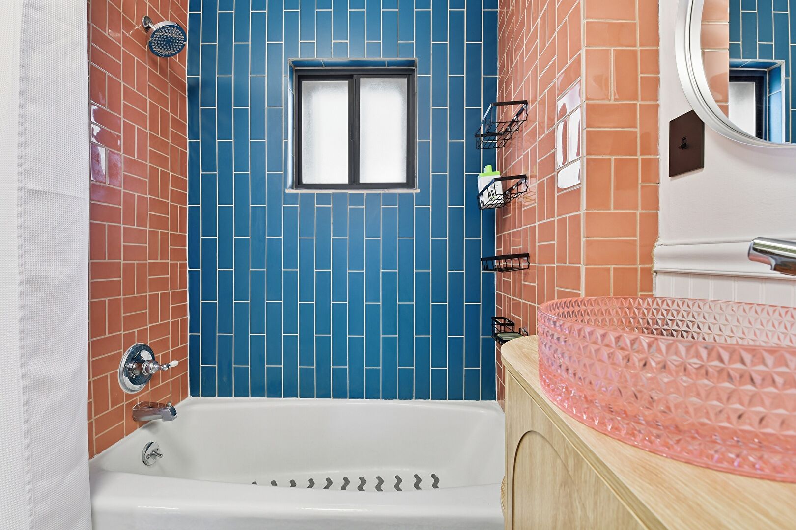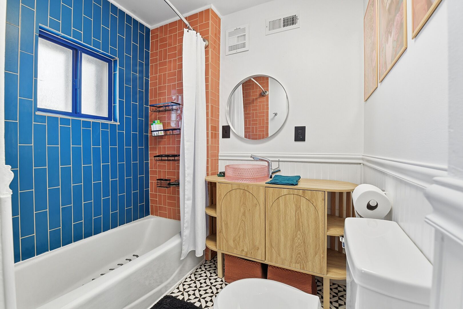 Combined Bath Shower, Drywall, Full Bathroom, Natural Light, Vanity, Vent, Vinyl Floor, Wainscot Wall, Drywall, Tile Wall, Wainscot Wall