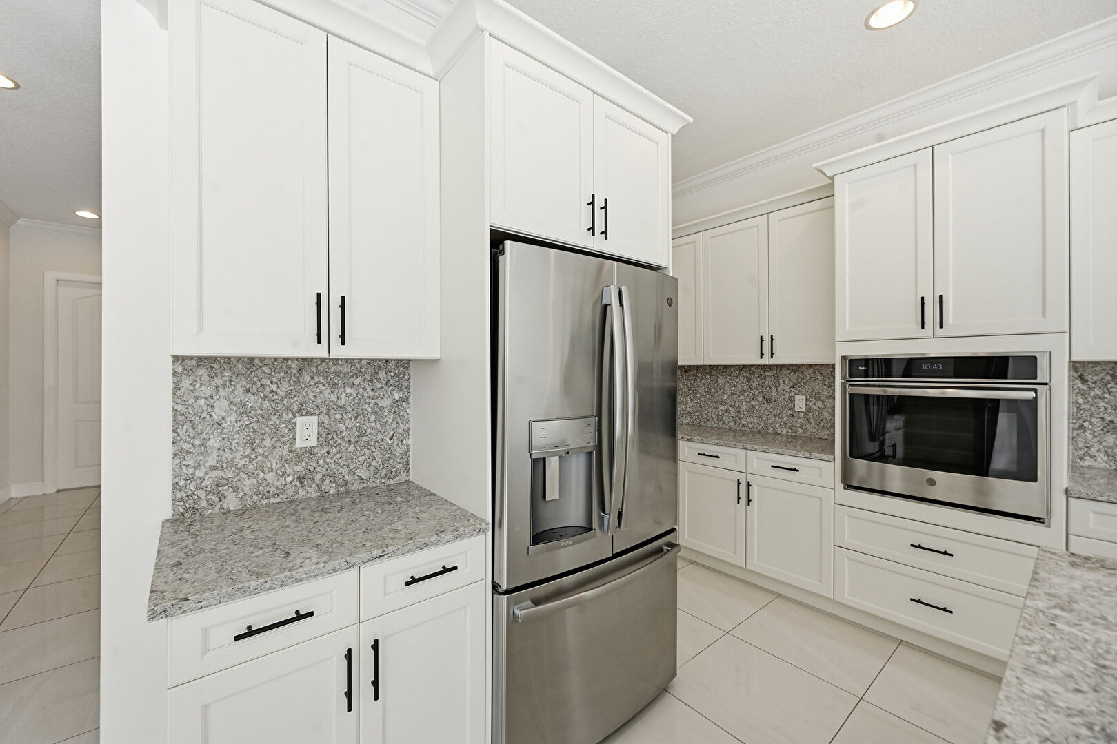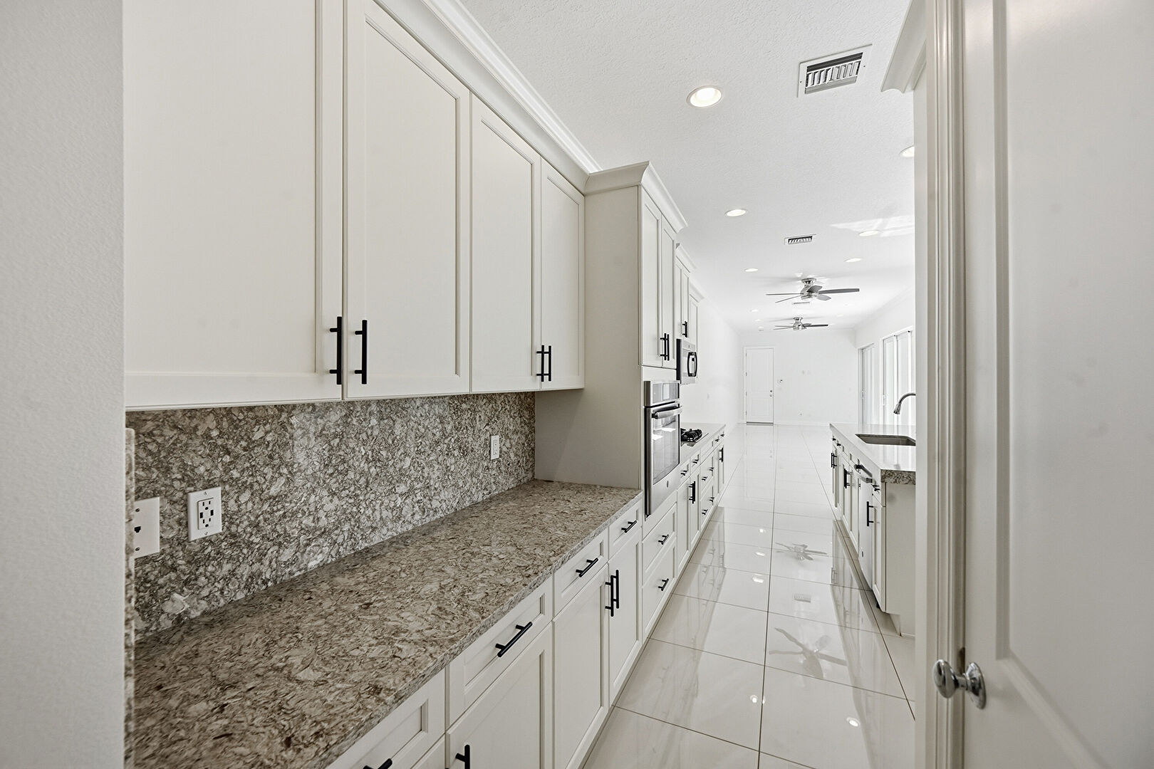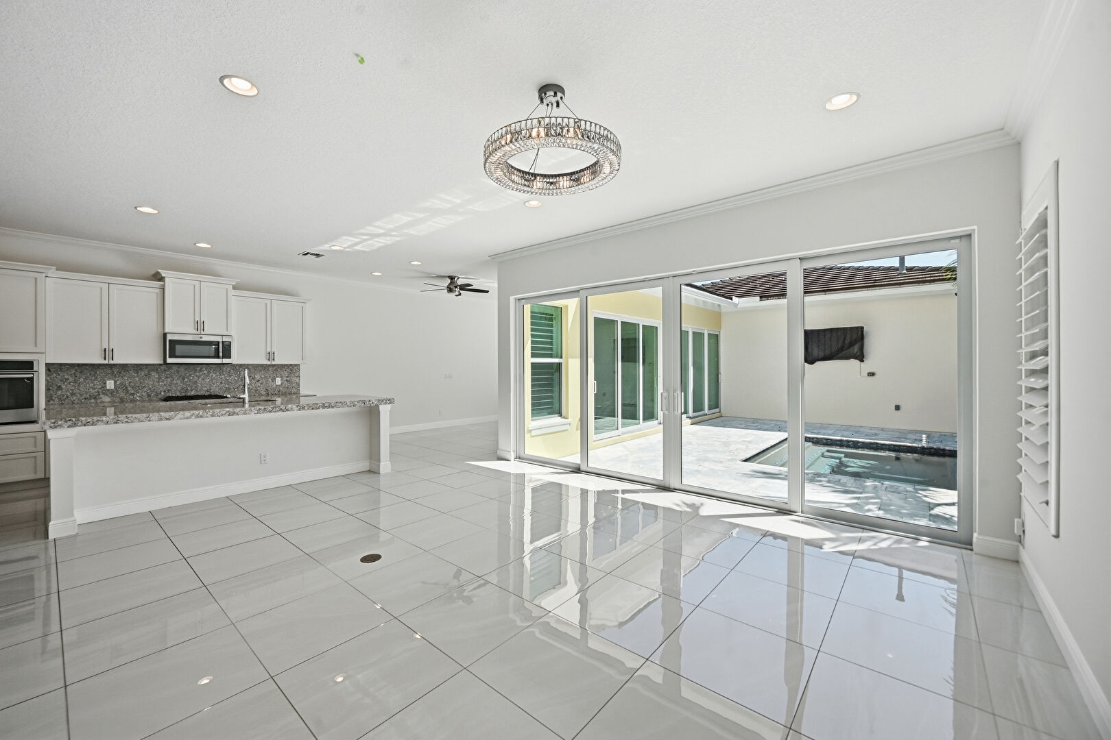Baseboards Wall, Ceiling Fan, Crown Molding, Crown Molding Cabinets, Drywall, Kitchen Bar, Kitchen Island, L Shaped Kitchen, Natural Light, Notable Chandelier, Opens To Living Area, Pendant Lighting, Recessed Lighting, Shaker Cabinets, Stone Countertops, Tile Floor, Vent, Baseboards Wall, Ceiling Fan, Crown Molding Cabinets, Drywall, Recessed Lighting, Shaker Cabinets, Tile Floor