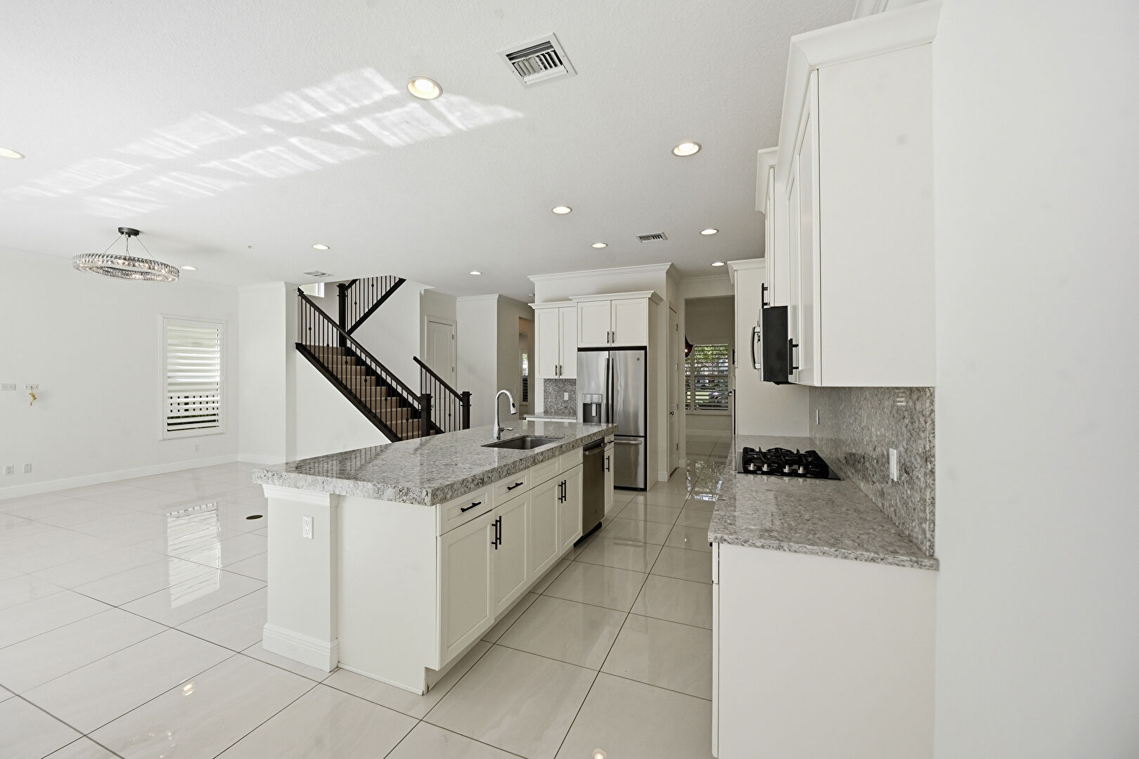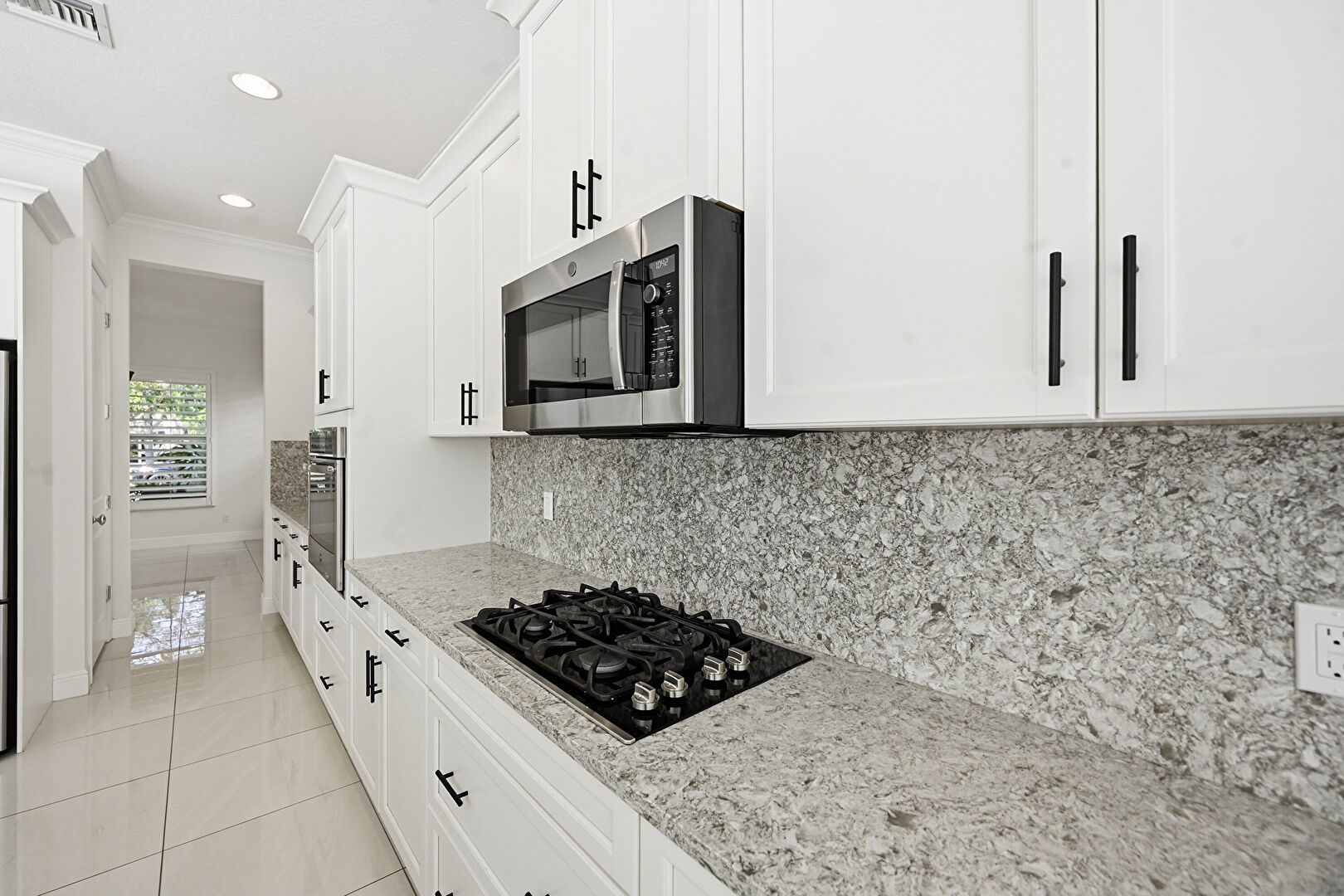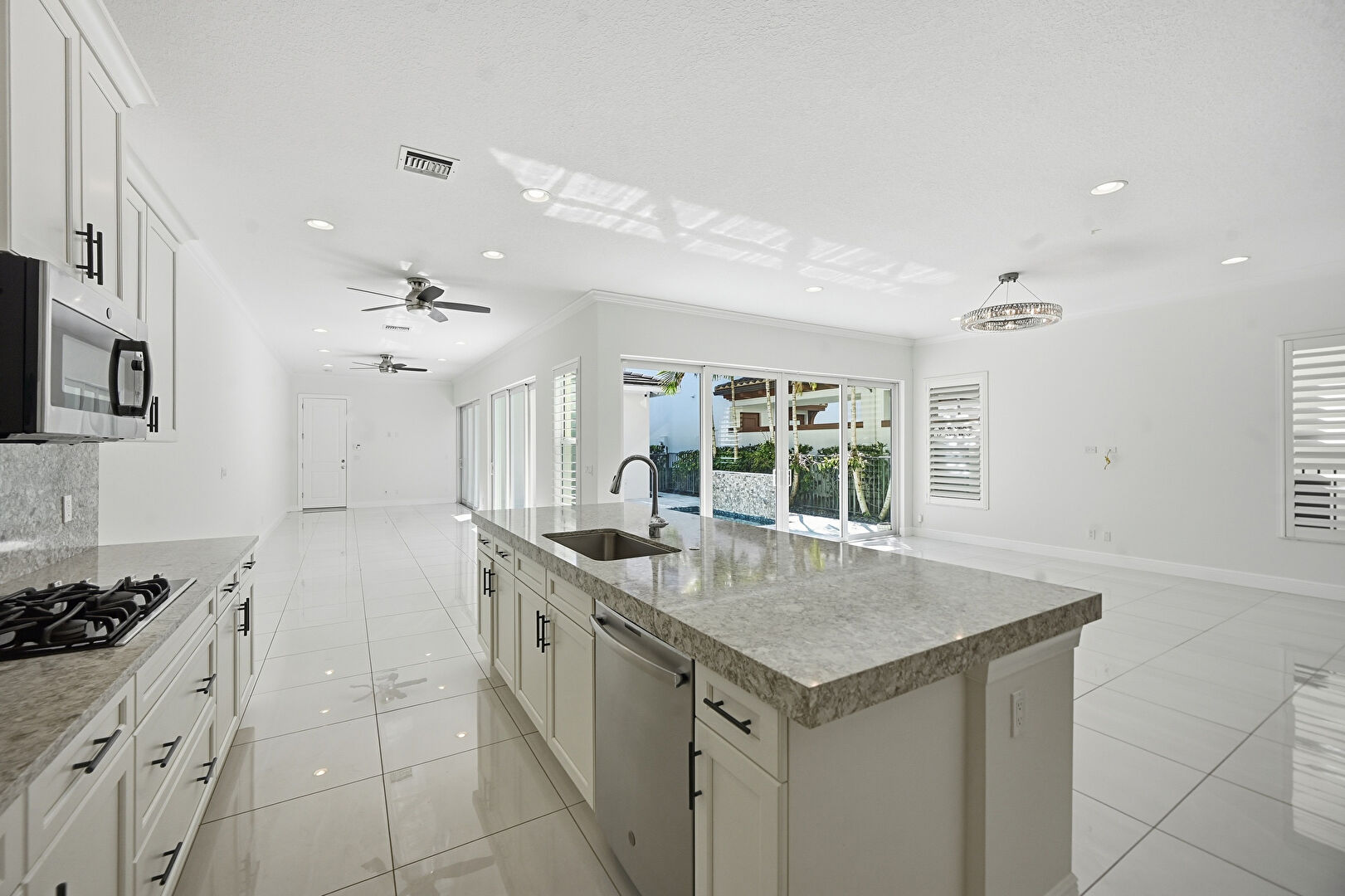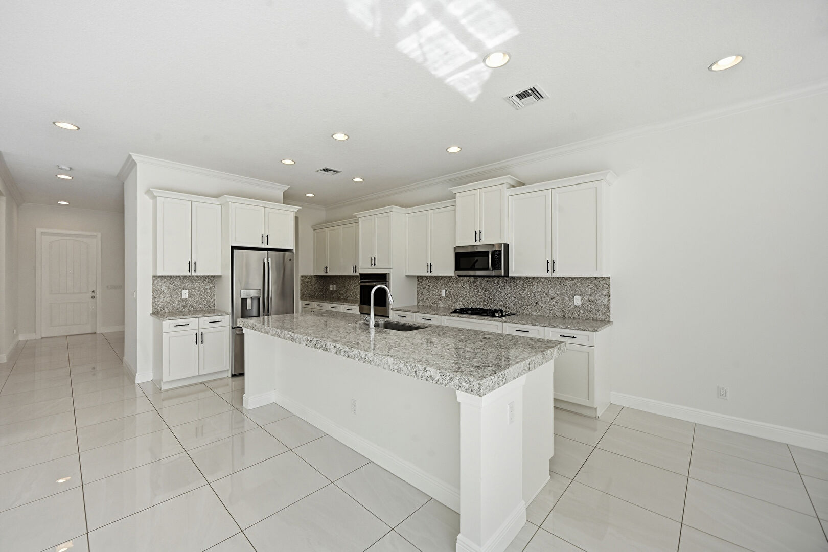 Baseboards Wall, Ceiling Fan, Crown Molding, Crown Molding Cabinets, Drywall, Kitchen Bar, Kitchen Island, L Shaped Kitchen, Natural Light, Notable Chandelier, Opens To Living Area, Pendant Lighting, Recessed Lighting, Shaker Cabinets, Stone Countertops, Tile Floor, Vent, Baseboards Wall, Ceiling Fan, Crown Molding Cabinets, Drywall, Recessed Lighting, Shaker Cabinets, Tile Floor