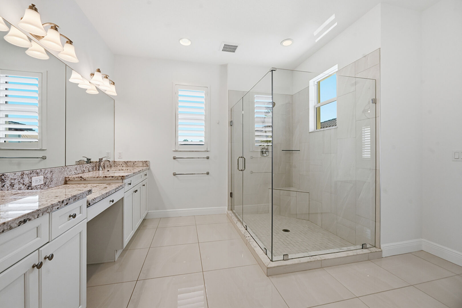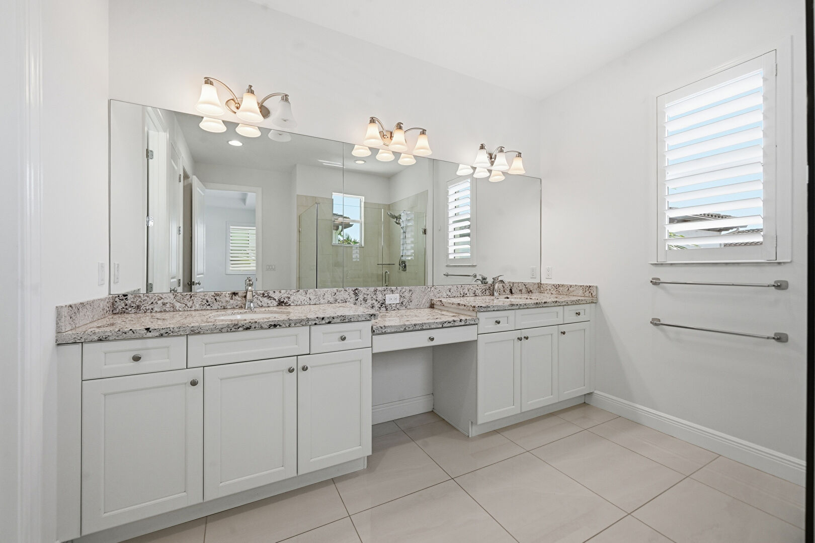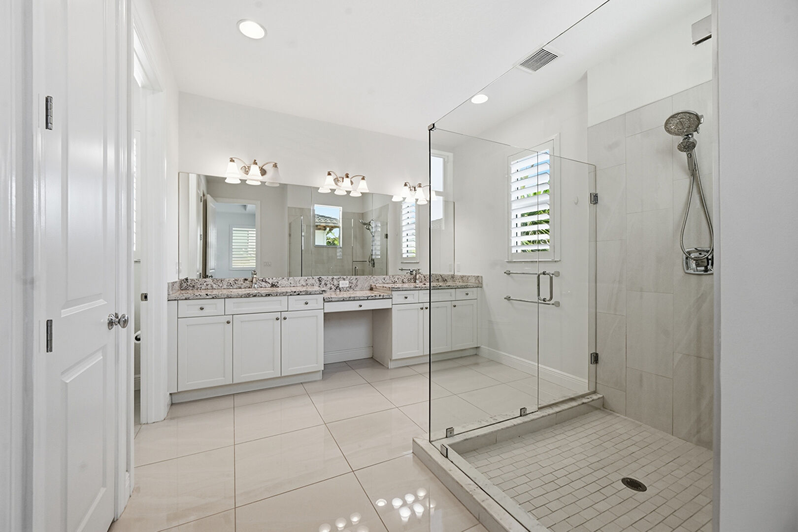 Baseboards Wall, Combined Bath Shower, Double Vanity, Drywall, Full Bathroom, Natural Light, Recessed Lighting, Tile Floor, Two Single Vanities, Vanity, Vent, Full Bathroom, Natural Light, Recessed Lighting, Vanity