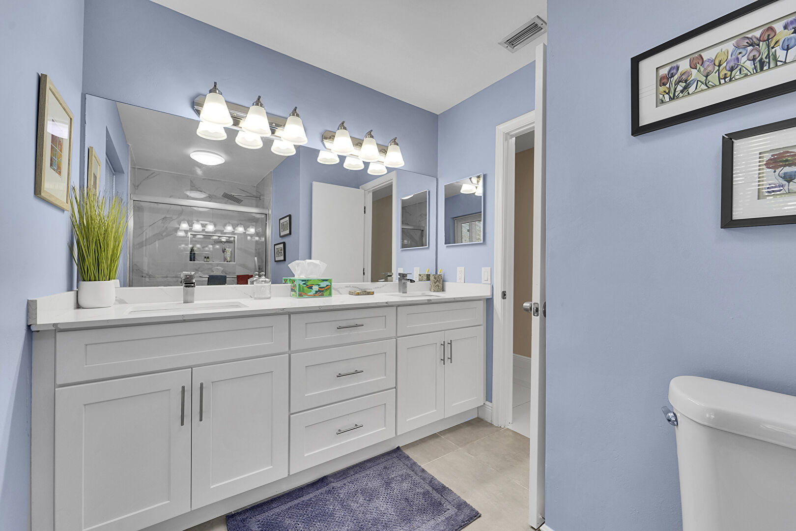 Baseboards Wall, Double Vanity, Drywall, Full Bathroom, Natural Light, Notable Chandelier, Tile Floor, Vent, Baseboards Wall, Tile Floor, Vanity