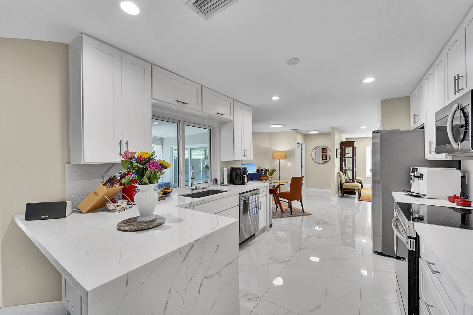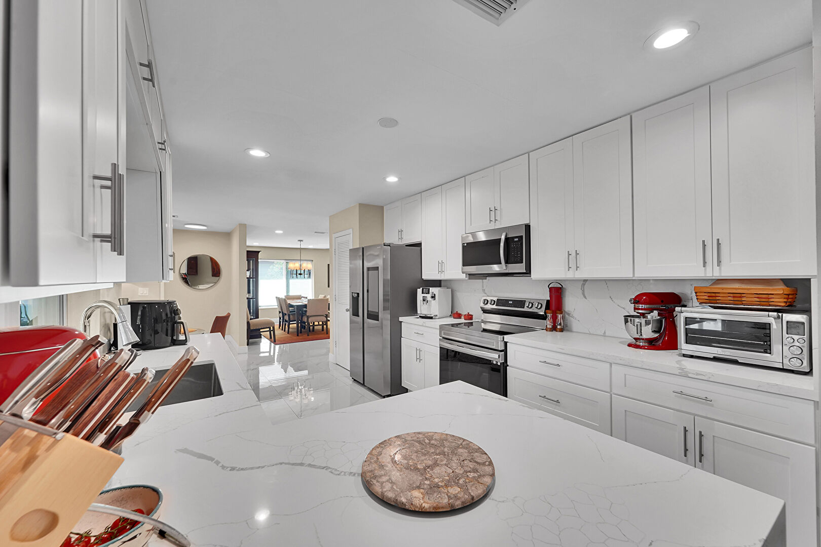 Baseboards Wall, Drywall, Kitchen Peninsula, Marble Finish Floor, Natural Light, Notable Chandelier, Opens To Living Area, Pendant Lighting, Recessed Lighting, Shaker Cabinets, Stone Countertops, Toaster, U Shaped Kitchen, Vent, Drywall, Kitchen Peninsula, Marble Finish Floor