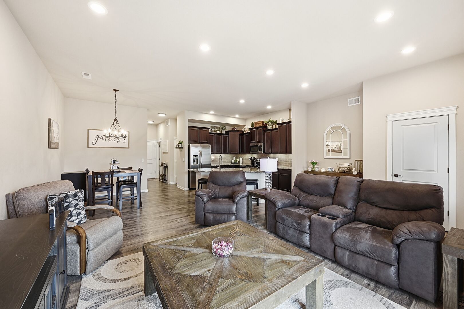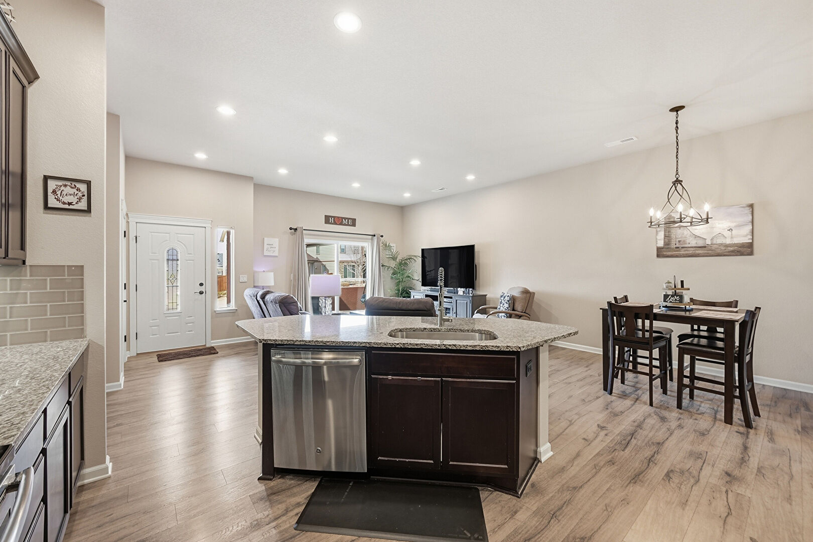 Baseboards Wall, Drywall, L Shaped Kitchen, Natural Light, Notable Chandelier, Recessed Lighting, Vent, Wood Finish Floor, Notable Chandelier, Wood Finish Floor