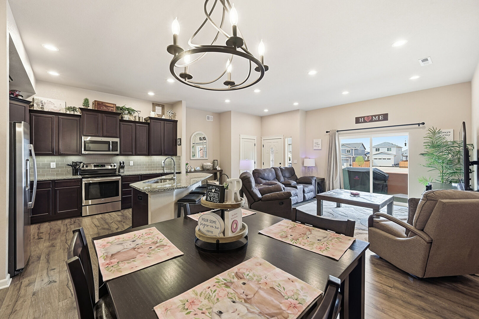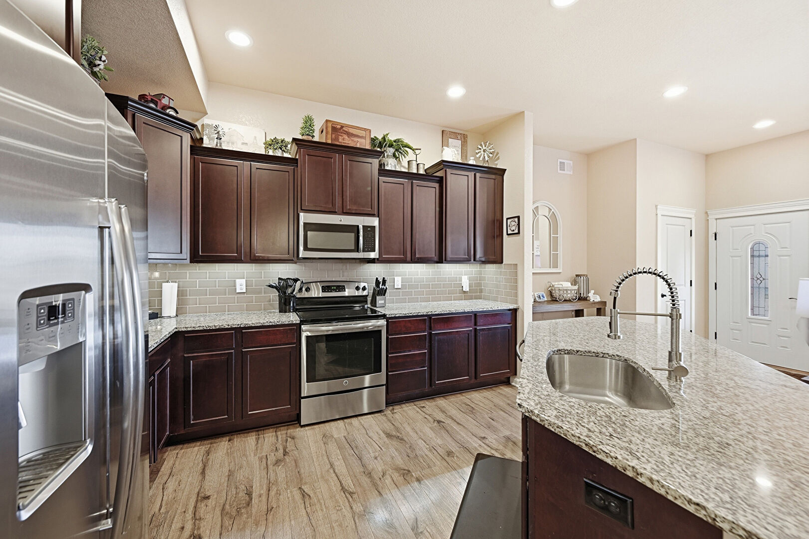 Baseboards Wall, Crown Molding Cabinets, Dark Brown Cabinets, Drywall, Kitchen Island, L Shaped Kitchen, Notable Chandelier, Opens To Living Area, Pendant Lighting, Recessed Lighting, Shaker Cabinets, Stone Countertops, Vent, Wood Finish Floor, Drywall, Kitchen Bar, Natural Light, Stone Countertops