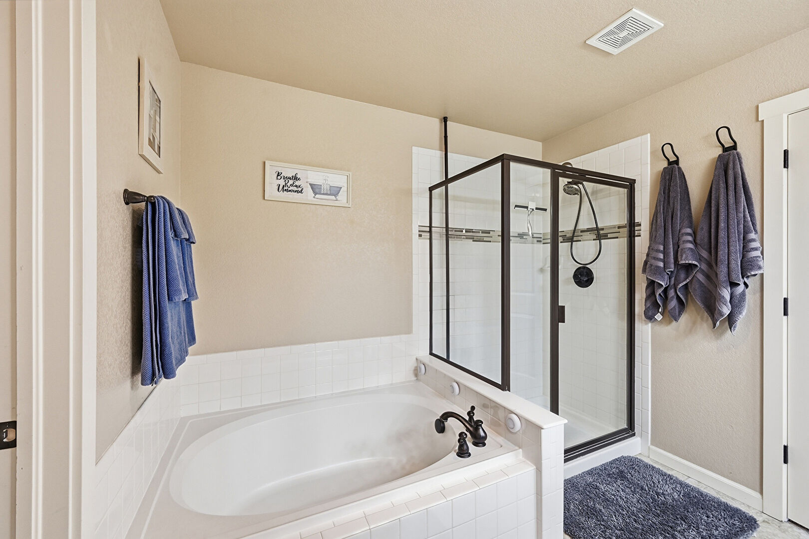 Double Vanity, Drywall, Full Bathroom, Recessed Lighting, Tile Floor, Vent, Walk In Closet, Baseboards Wall