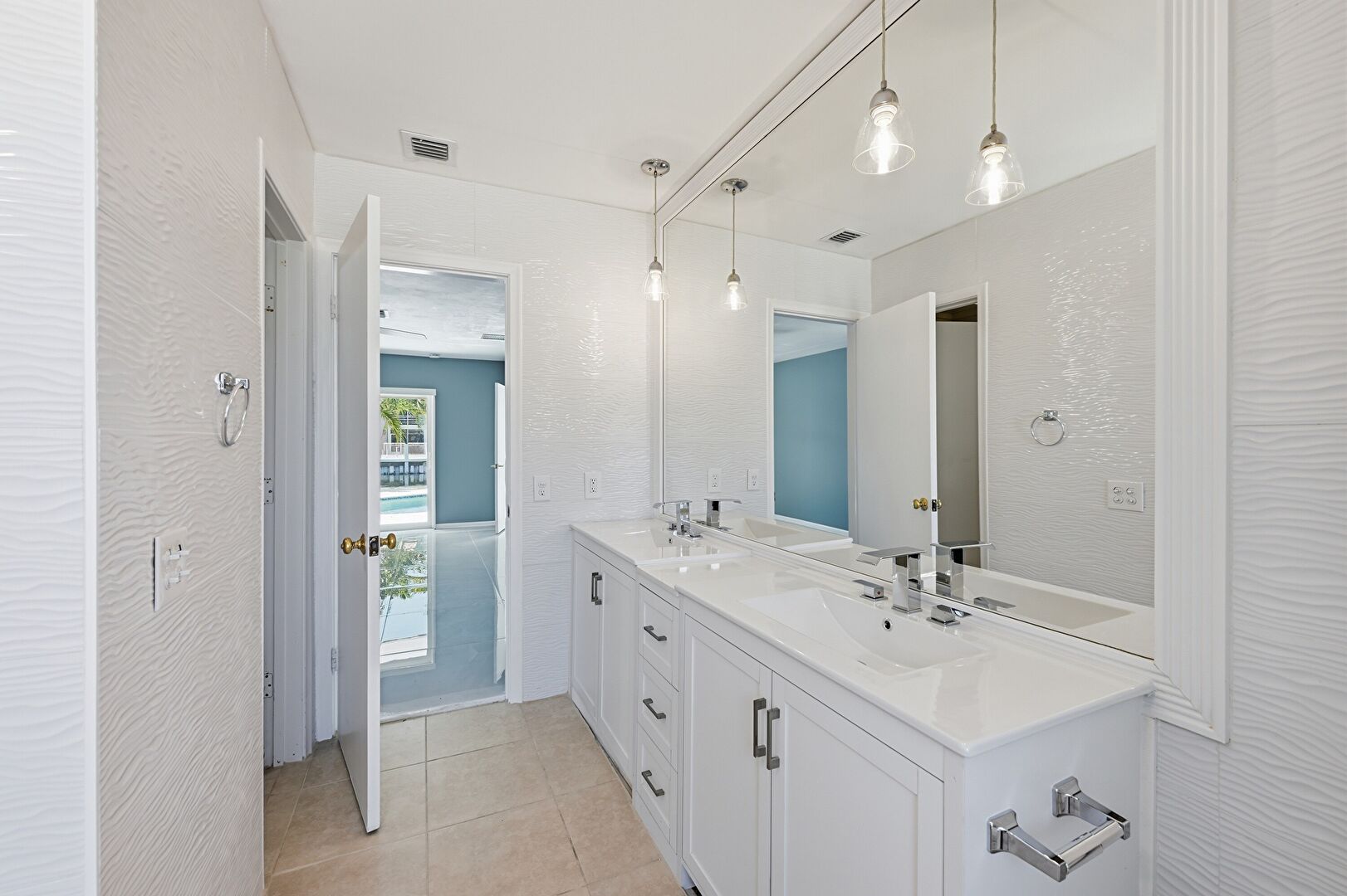 Combined Bath Shower, Double Vanity, Full Bathroom, Natural Light, Textured Wall, Tile Floor, Tile Wall, Vanity, Vent, Full Bathroom, Tile Floor, Vent