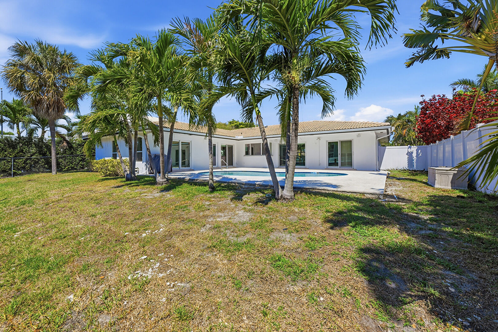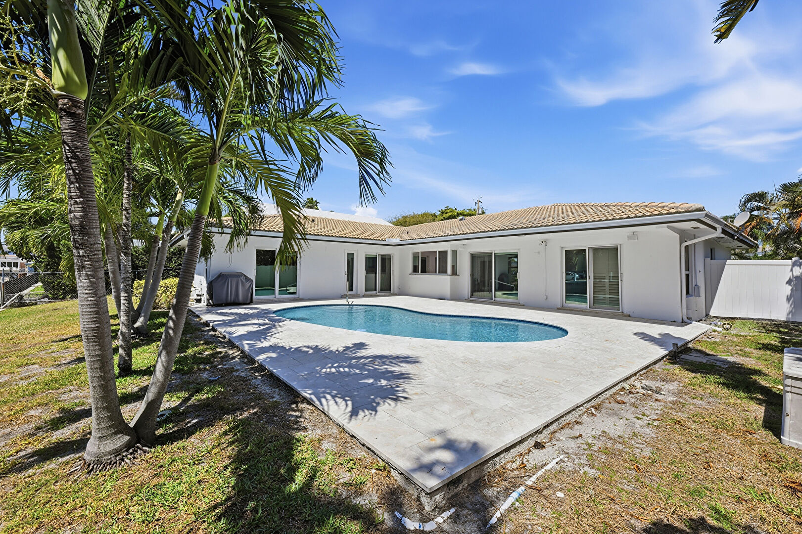Downspout, Fence, Gutters, Handrail, Lawn, Patio, Pool, Stucco Siding, Tile Roof, Downspout, Gutters, Handrail