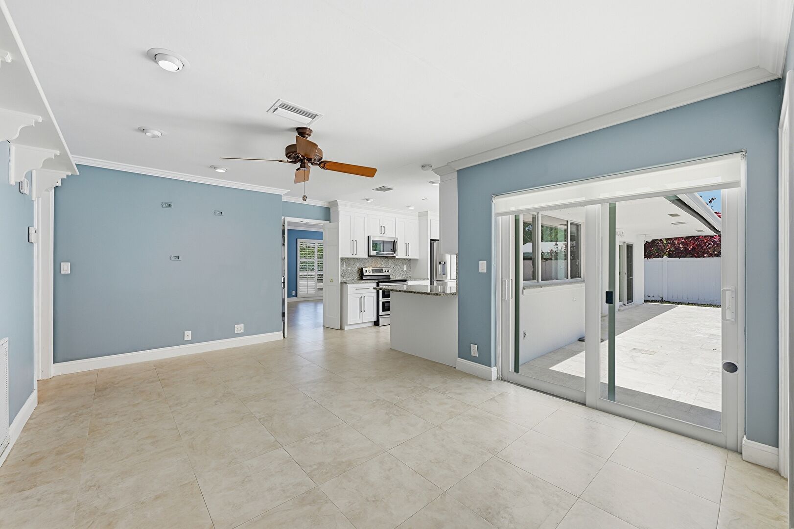 Baseboards Wall, Ceiling Fan, Crown Molding, Crown Molding Cabinets, Drywall, Kitchen Peninsula, Natural Light, Opens To Living Area, Shaker Cabinets, Smoke Carbon Monoxide Detector, Stone Countertops, Tile Floor, Vent, G Shaped Kitchen, Kitchen Bar, Tile Floor, Vent